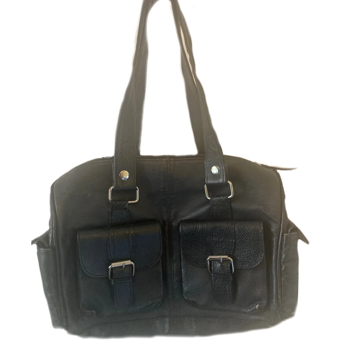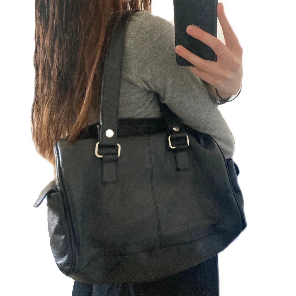 Jättesöt svart väska med silverdetaljer och många fickor. Bra skick och rymlig väska, skriv för mått. Köparen står för frakt :)