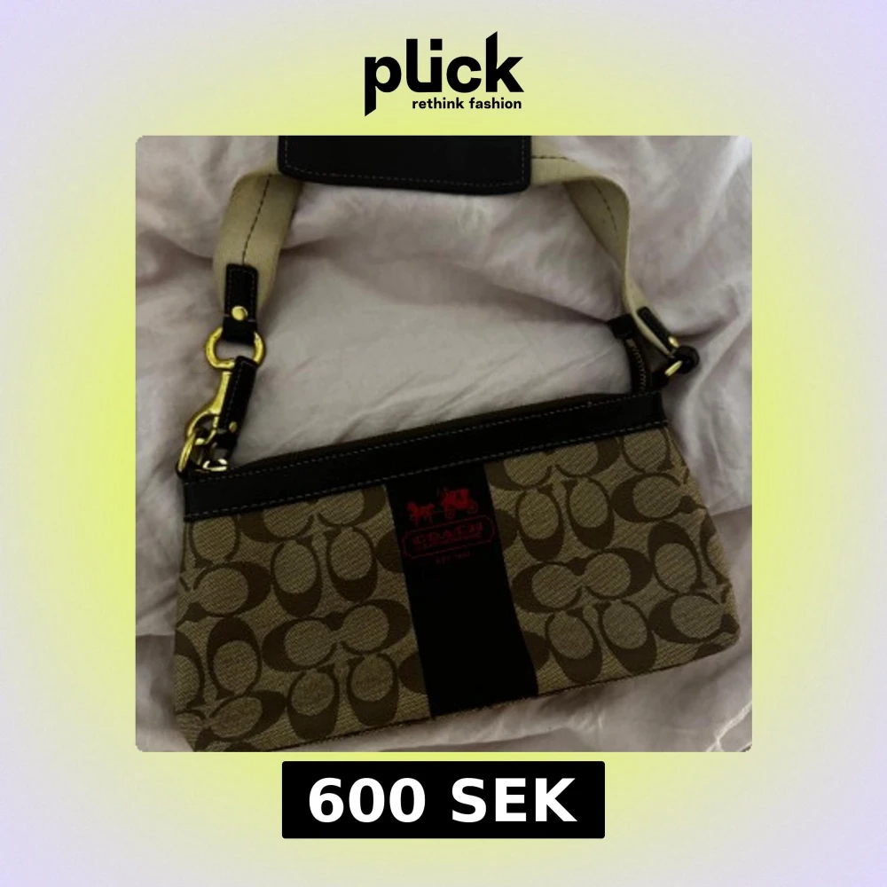 Snygg axelväska från Coach i beige och brunt med deras ikoniska mönster. Väskan har en justerbar axelrem och detaljer i svart och guld. Perfekt för att ge din outfit en lyxig touch.