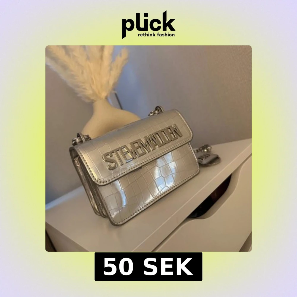 Snygg axelväska i metallic silver från Steve Madden med croco-mönstrad yta och kedjerem. Väskan har ett stort logotyp-spänne framtill och stilren, boxig form. Perfekt för dig som vill sticka ut med accessoarerna. Aldrig använd och i toppskick!