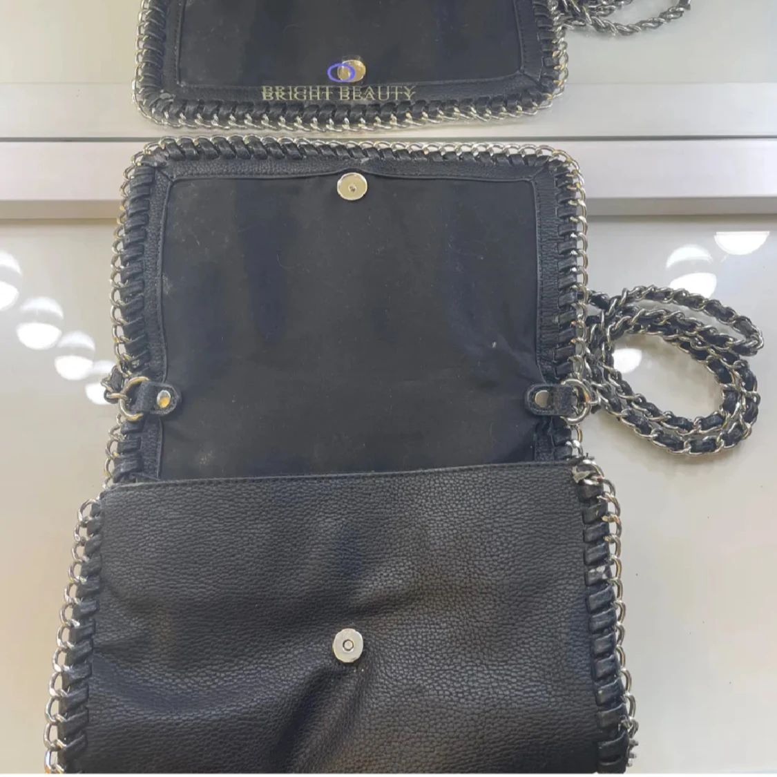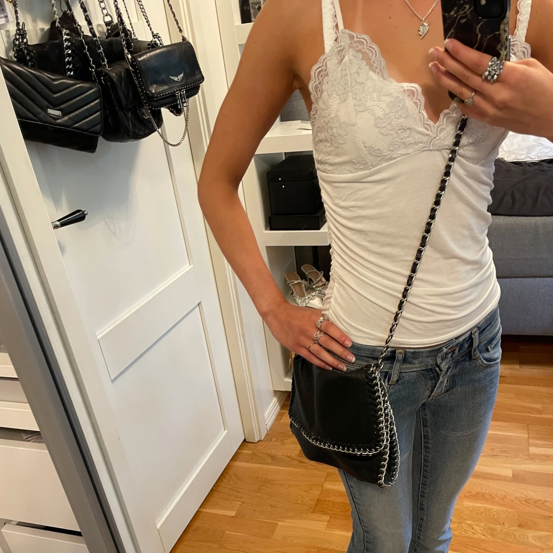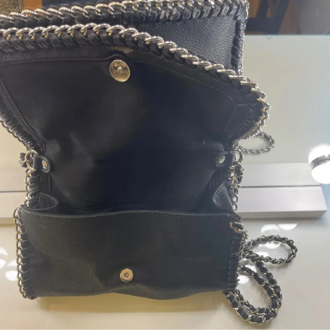 Svart axelväska med silverfärgade kedjor längs kanterna och som axelrem och stängs med magnet.