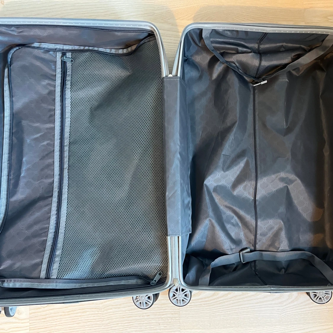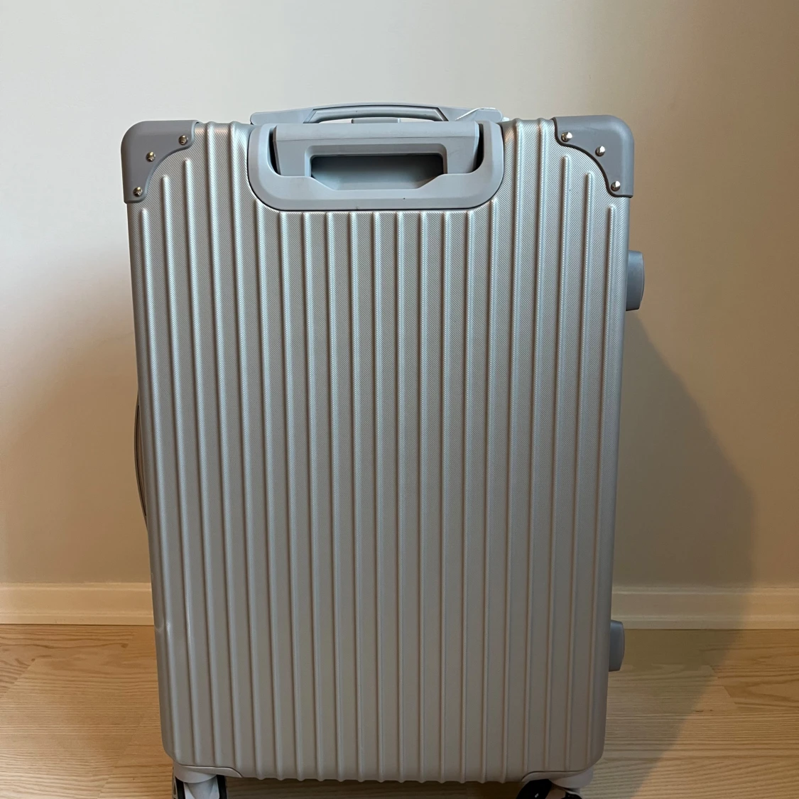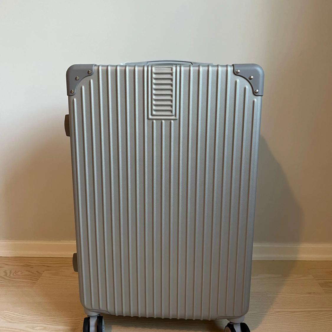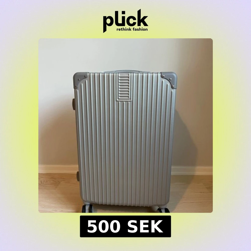 Snygg och stilren resväska i silver med randigt mönster och hårt skal. Väskan har fyra hjul, kodlås och praktiska handtag på både sidan och toppen. Perfekt för dig som vill resa smidigt och ha koll på dina grejer. Riktigt clean look och modern design.