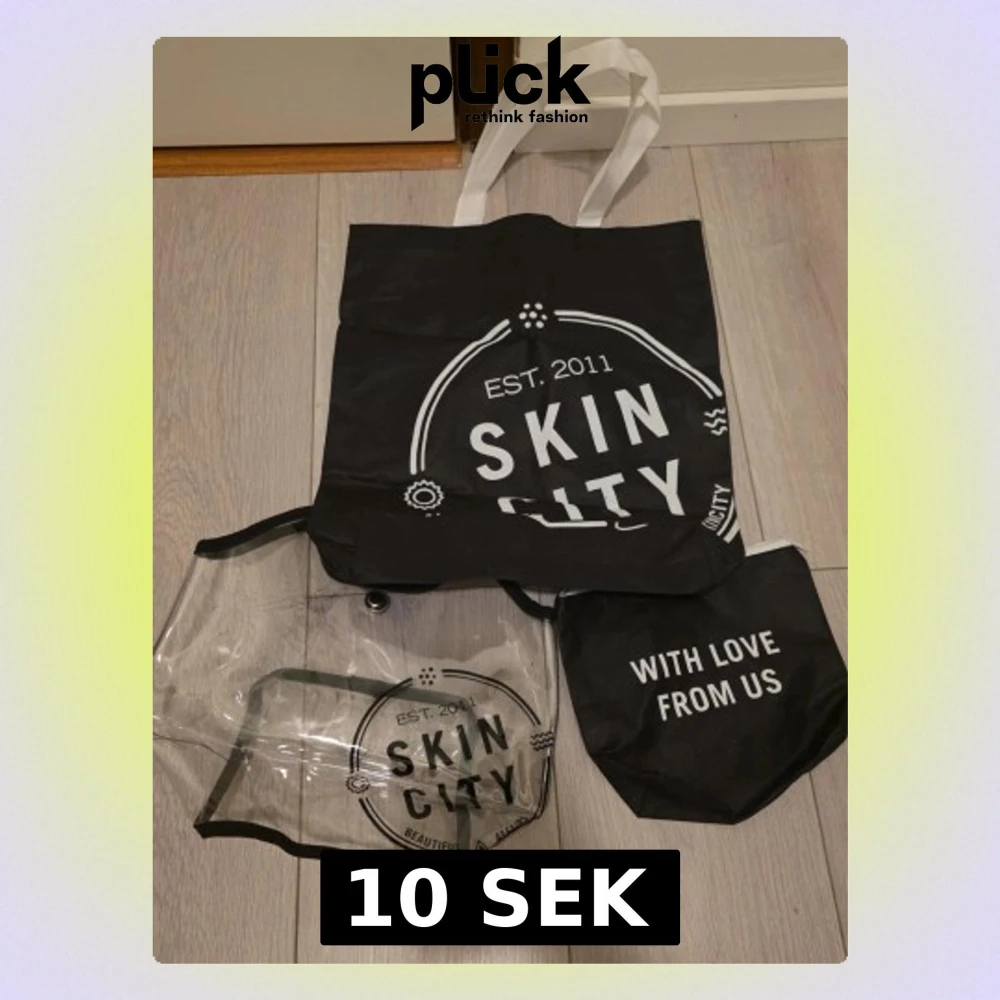 Säljer ett set med Skin City-väskor: en svart shoppingväska i syntet med vita handtag och tryck, en transparent necessär med svart kant och tryck, samt en mindre svart väska med vit text. Perfekt för att organisera dina grejer och ha med på språng. Den genomskinliga väskan har svarta missfärgningar från att ha legat på den svarta påsen.