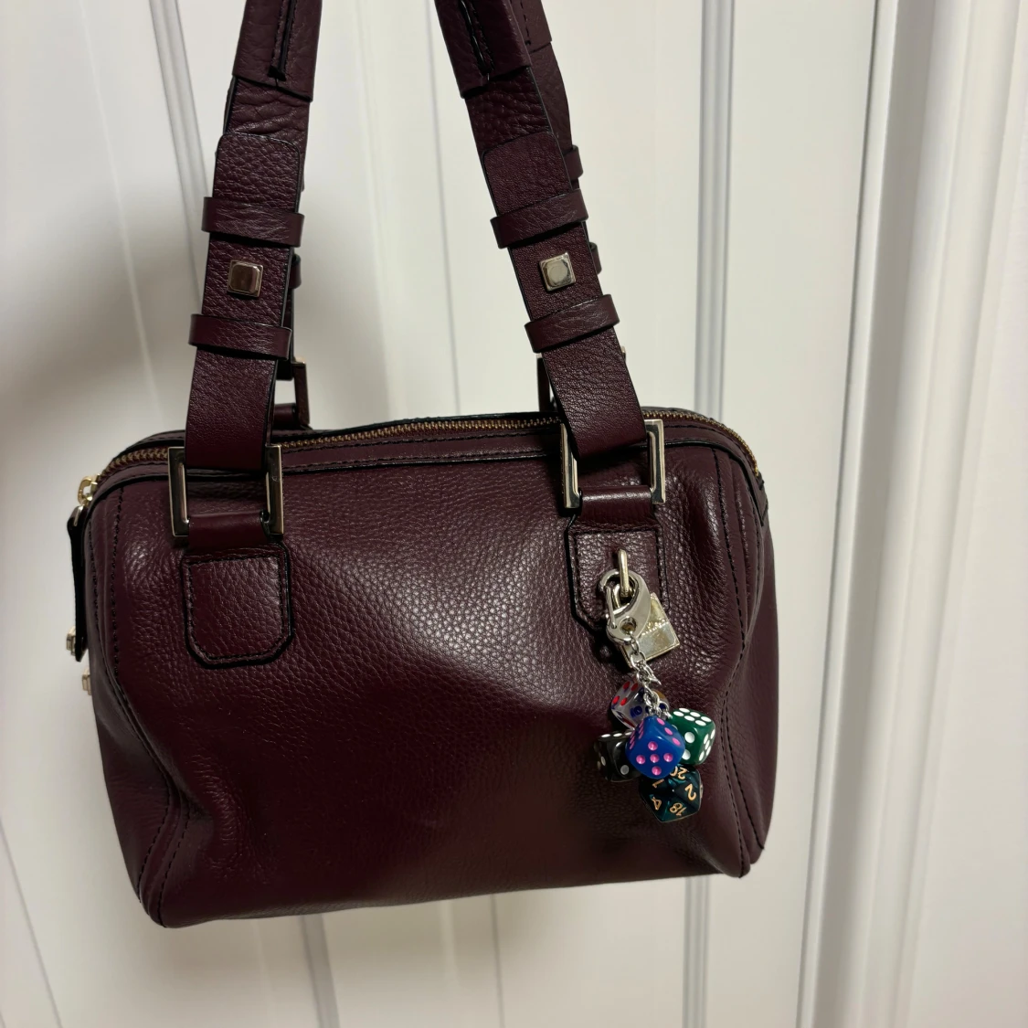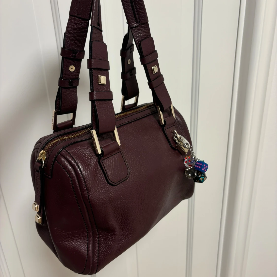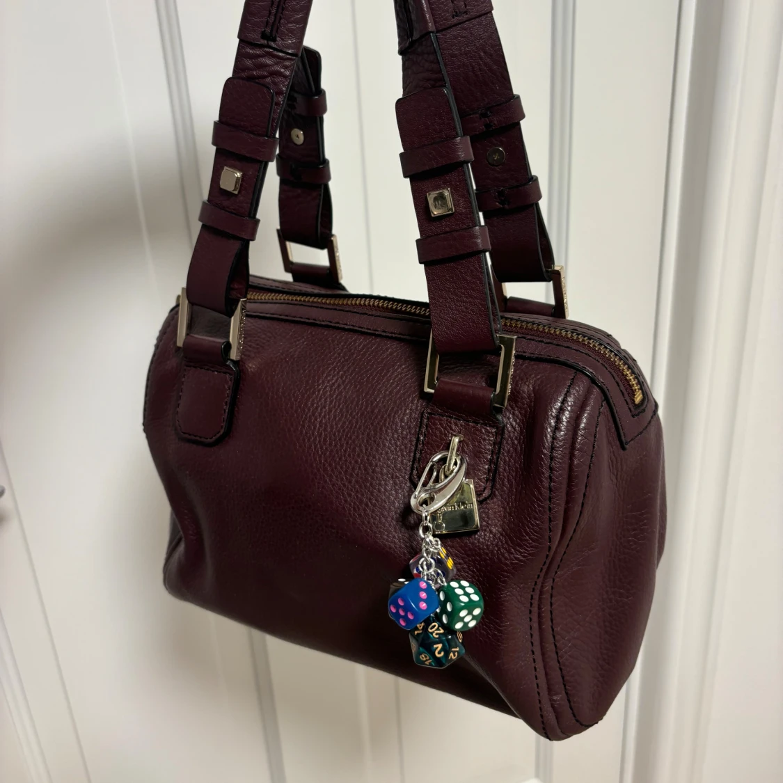 Snygg vinröd handväska från Calvin Klein i äkta skinn med grov struktur. Väskan har guldfärgade detaljer, dubbla handtag med coola spännen och en dragkedja upptill. Utsmyckad med en unik tärningscharm som ger extra personlighet.