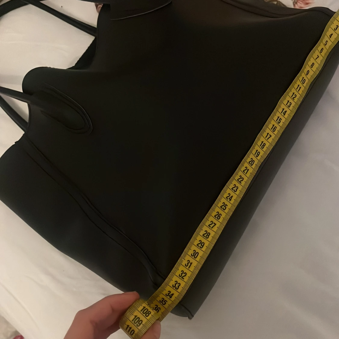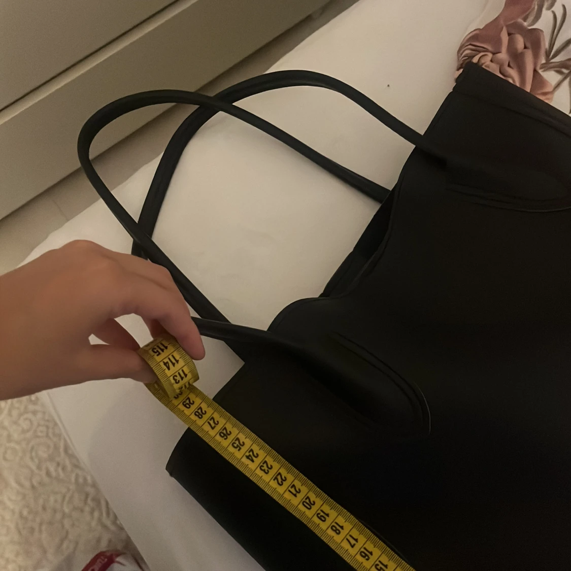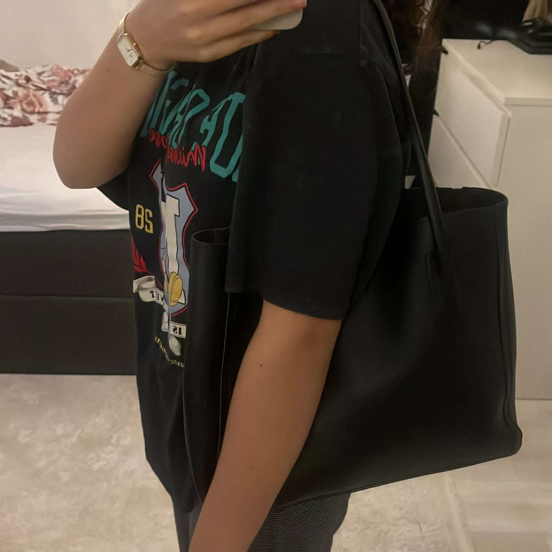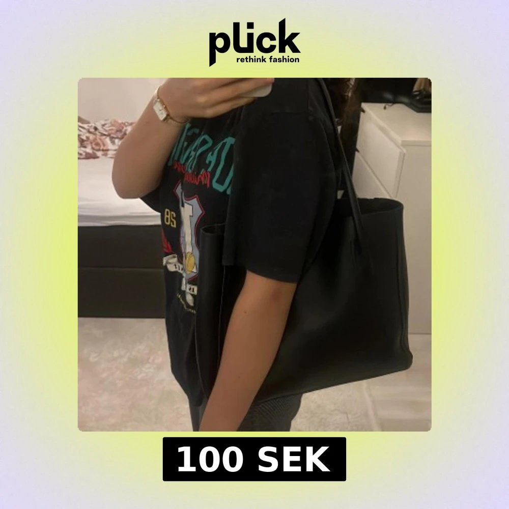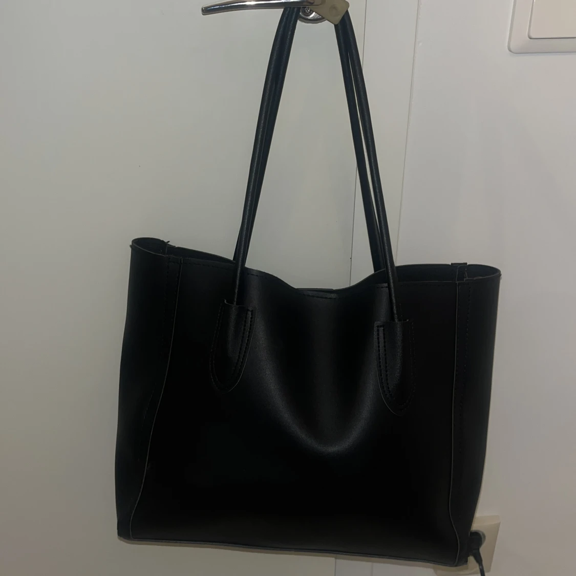 Stilren svart axelväska med långa handtag och rymlig insida. Väskan är i slät skinnimitation och har en enkel, klassisk design utan synliga detaljer eller mönster. Perfekt storlek för att få plats med allt du behöver under dagen. Bredden är 34cm och längden är 28cm.