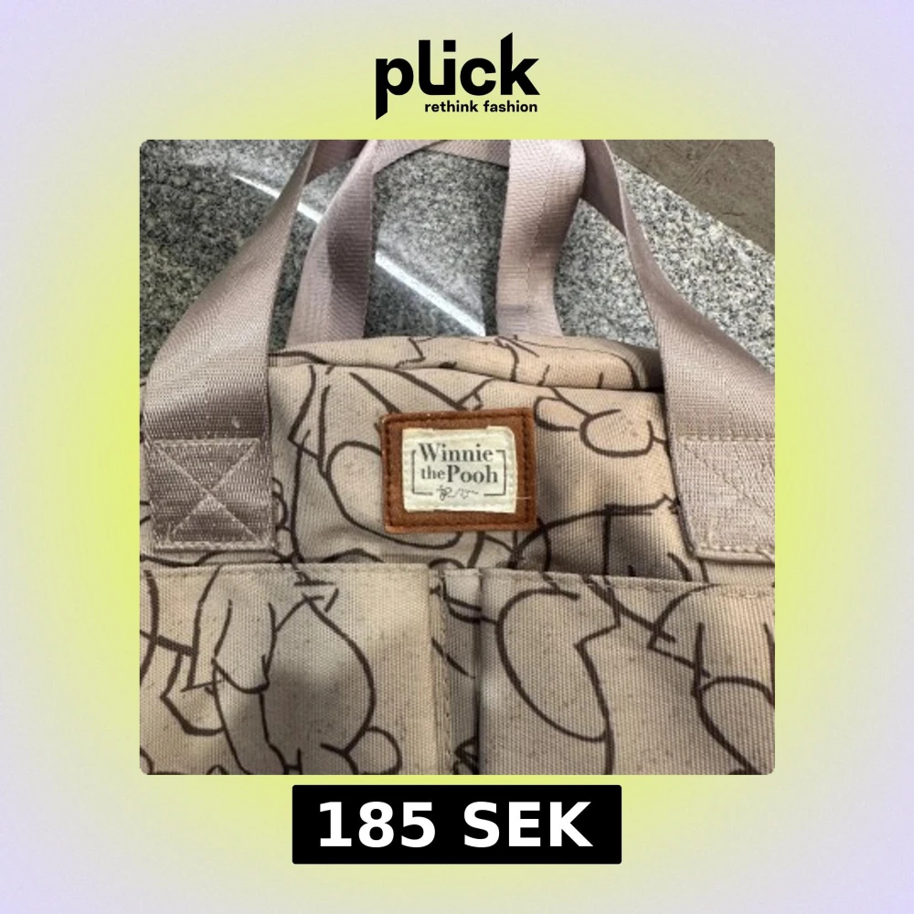 Superfin beige skötväska med brunt konturmönster av Nalle Puh över hela väskan. Väskan har två handtag, flera fack både inuti och utanpå samt dragkedja upptill. Tillverkad i slitstark bomullscanvas och har en söt etikett framtill.