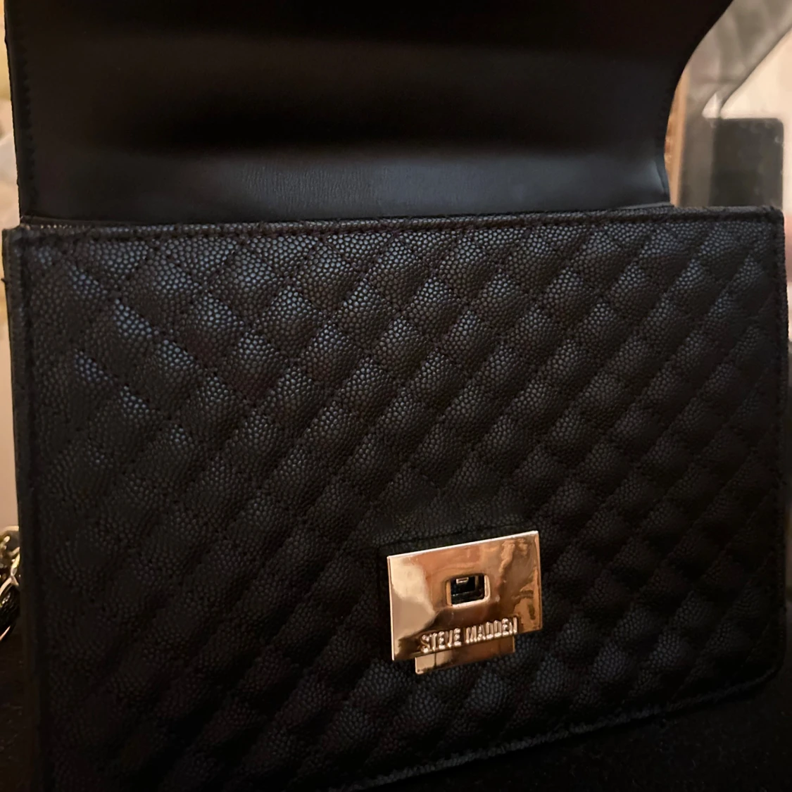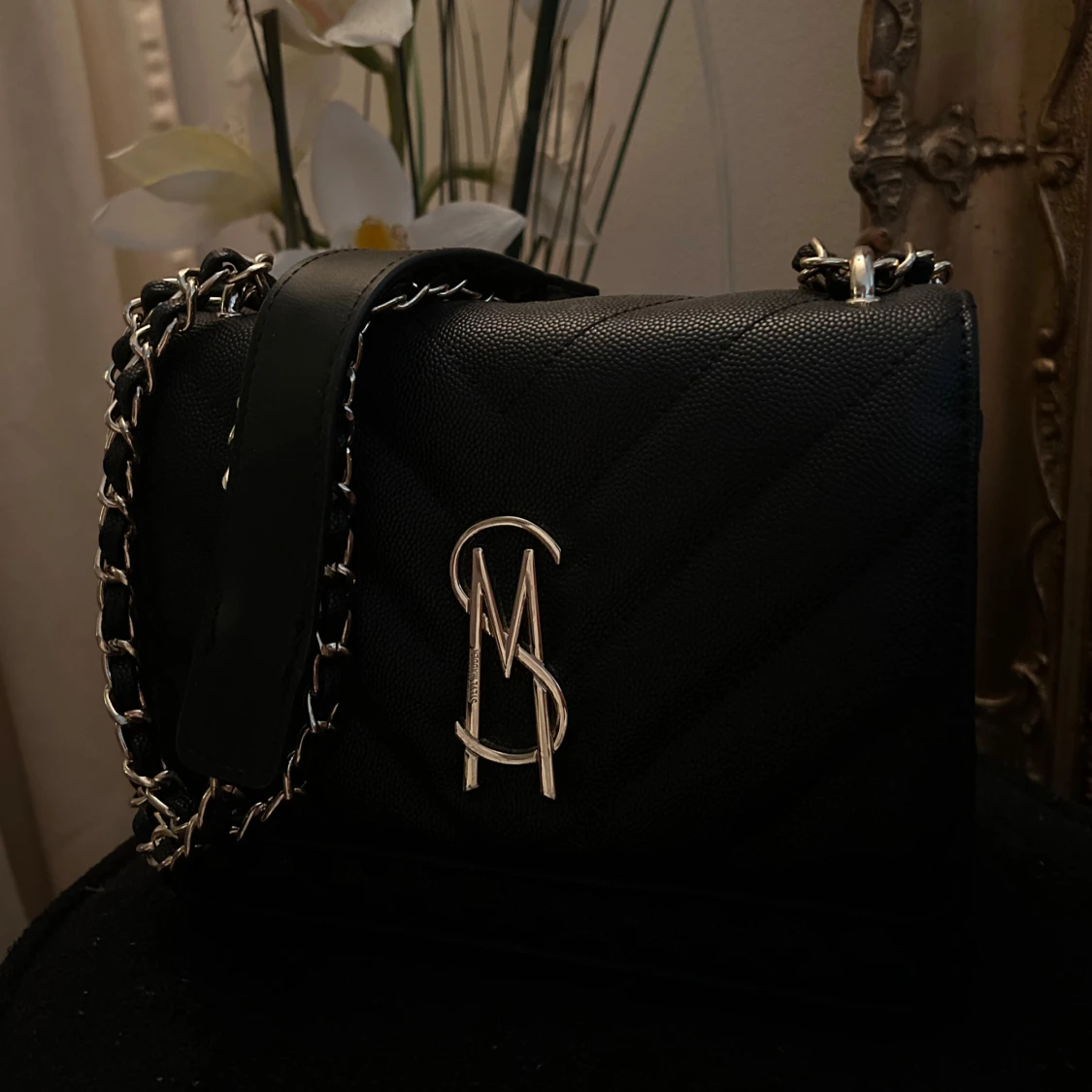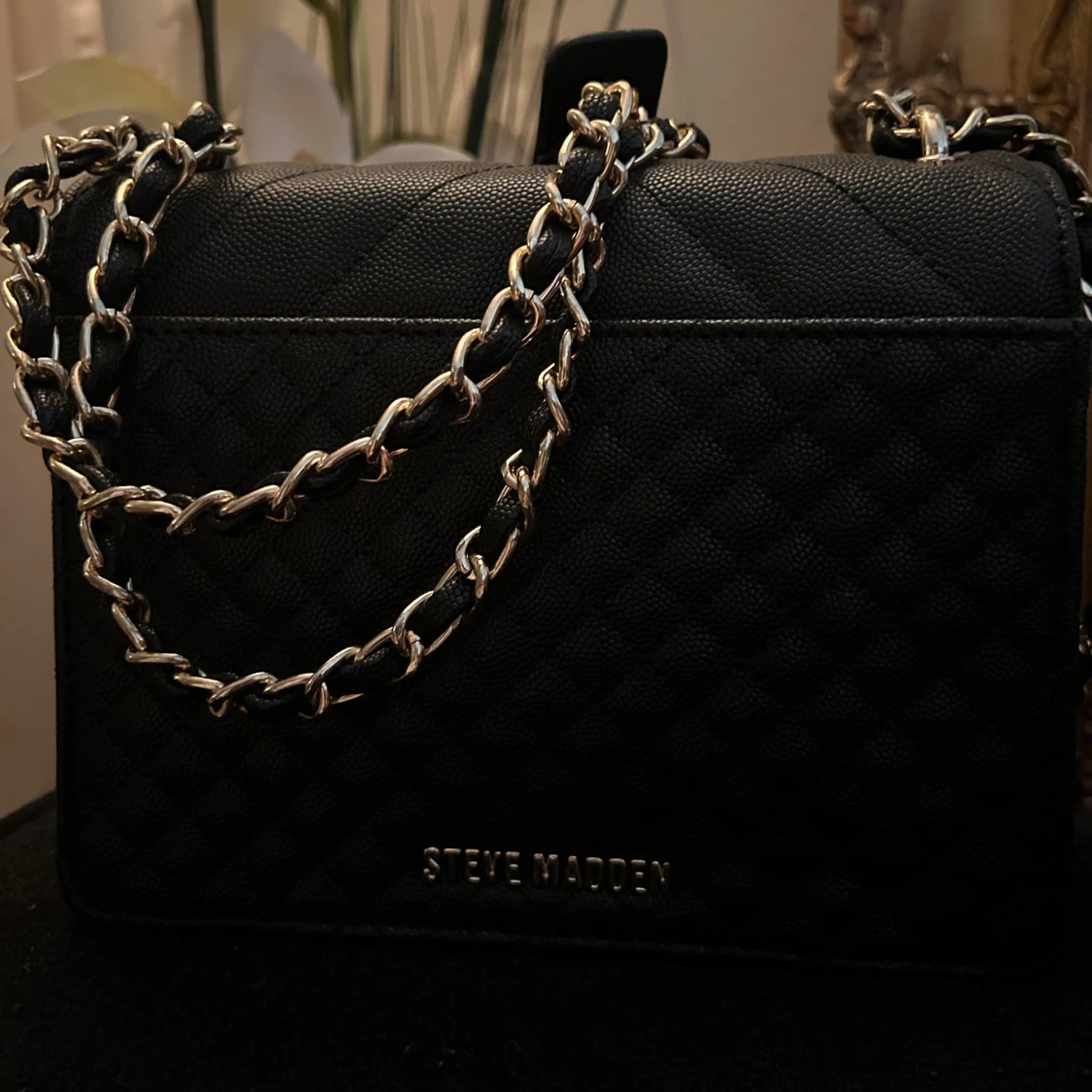 Snygg svart axelväska från Steve Madden med quiltad yta och kedjerem i silver. Väskan har ett stilrent SM-emblem framtill och ett metallspänne med logga. Perfekt storlek för det viktigaste och ger en cool vibe till din outfit. Inhandlades för 1500 kr - men jag säljer för billigare!💕väskan är ALDRIG ANVÄND!💕