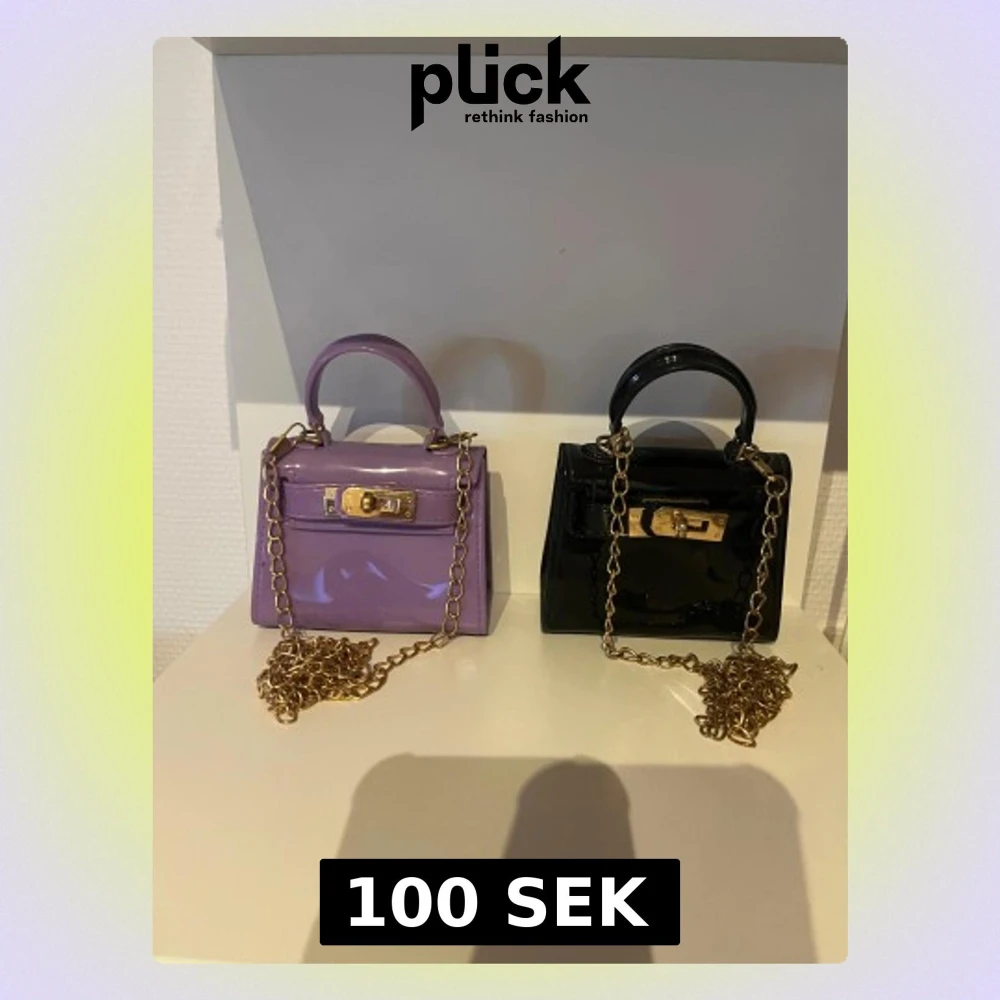 Två små handväskor i lila och svart med glansig finish, guldfärgade kedjor och låsdetaljer. Perfekt accessoar för att lyfta din outfit med en trendig touch. Väskorna har ett stilrent och kompakt format med handtag upptill. Den säljs båda för 100kr och en för 50kr.