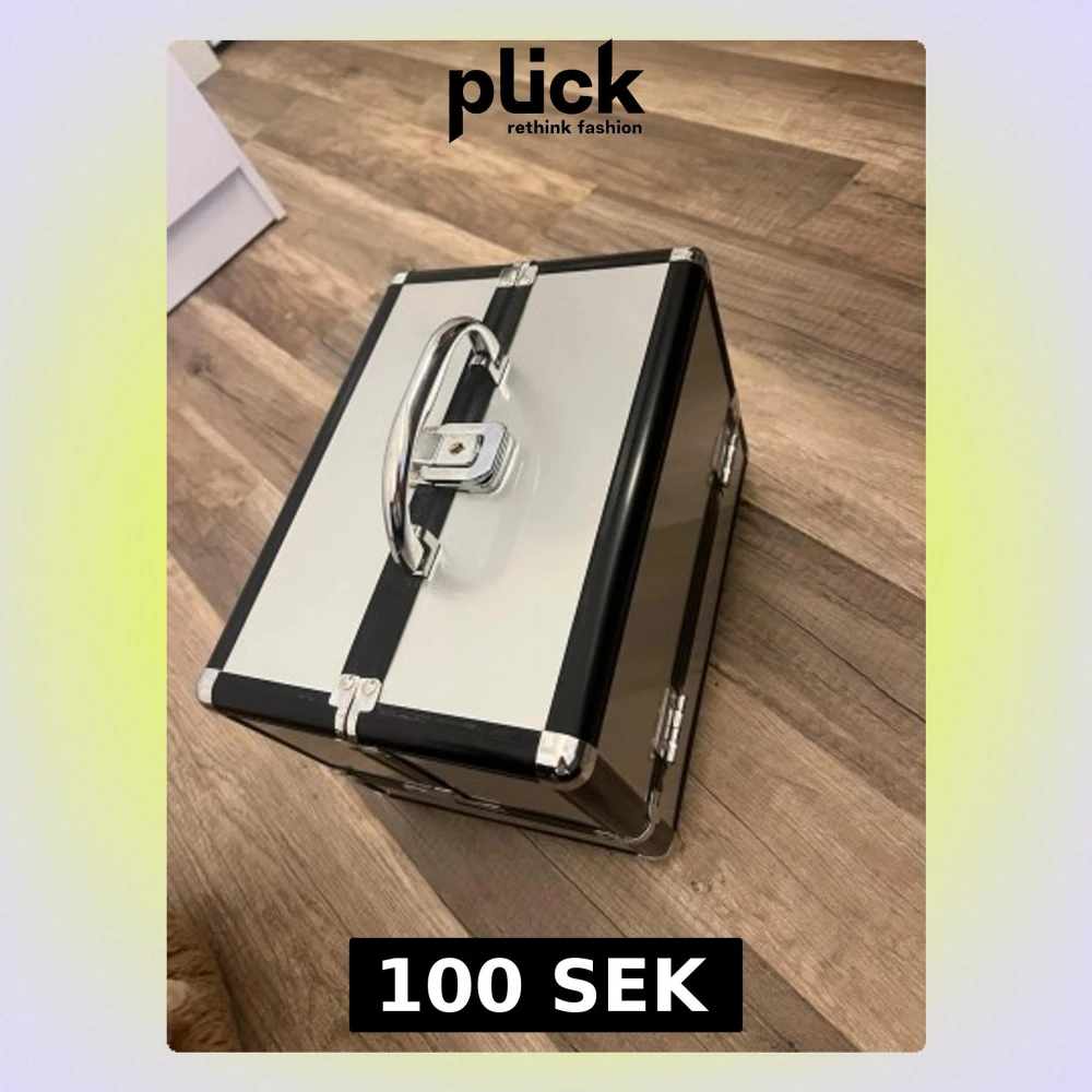 Säljer en stilren svart och silver smycke förvaring i hårt material med metallhandtag och lås. Aldrig använd. Smycke förvaringen har flera fack och insida i svart tyg, perfekt för att organisera dina prylar. Nyckel medföljer för extra säkerhet. Snygg och praktisk för dig som gillar ordning. Tveka inte på att höra av er vid några frågor💗