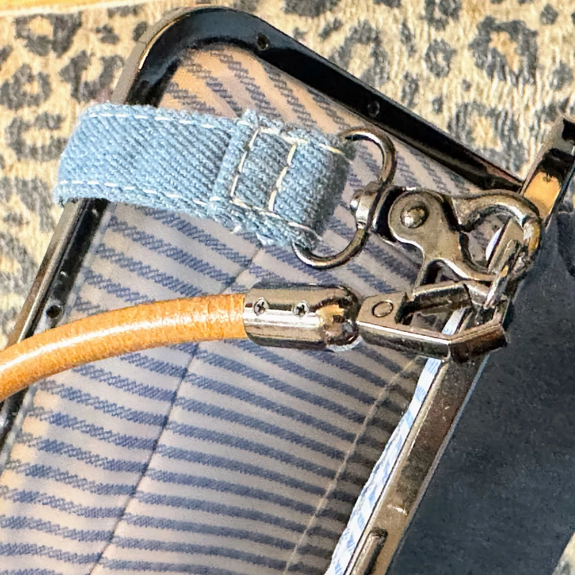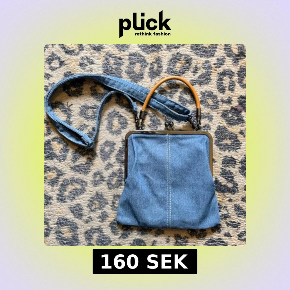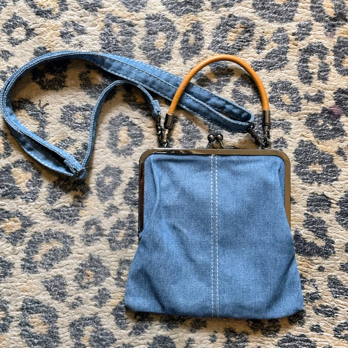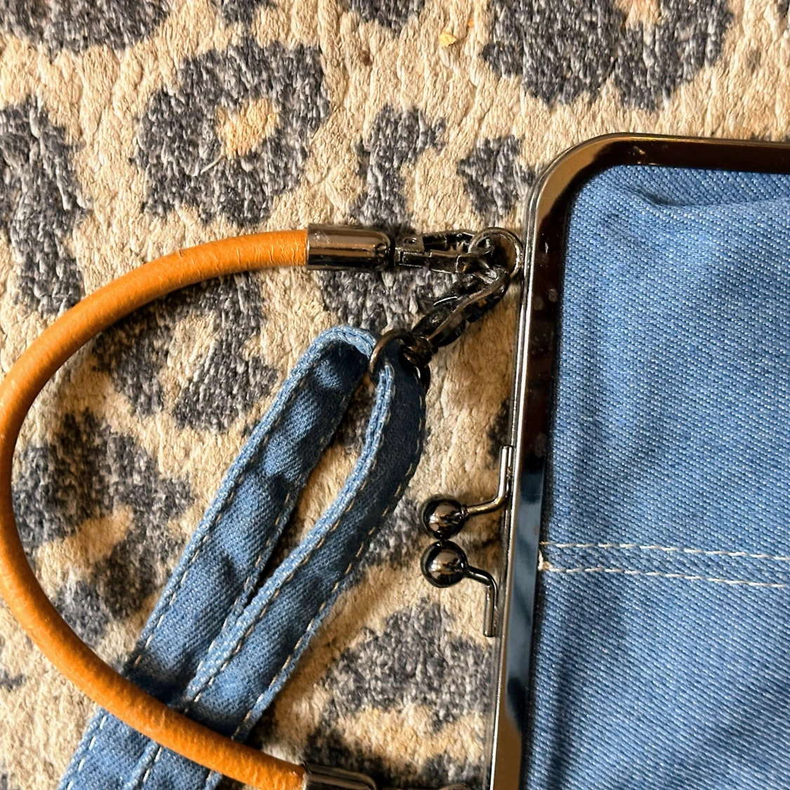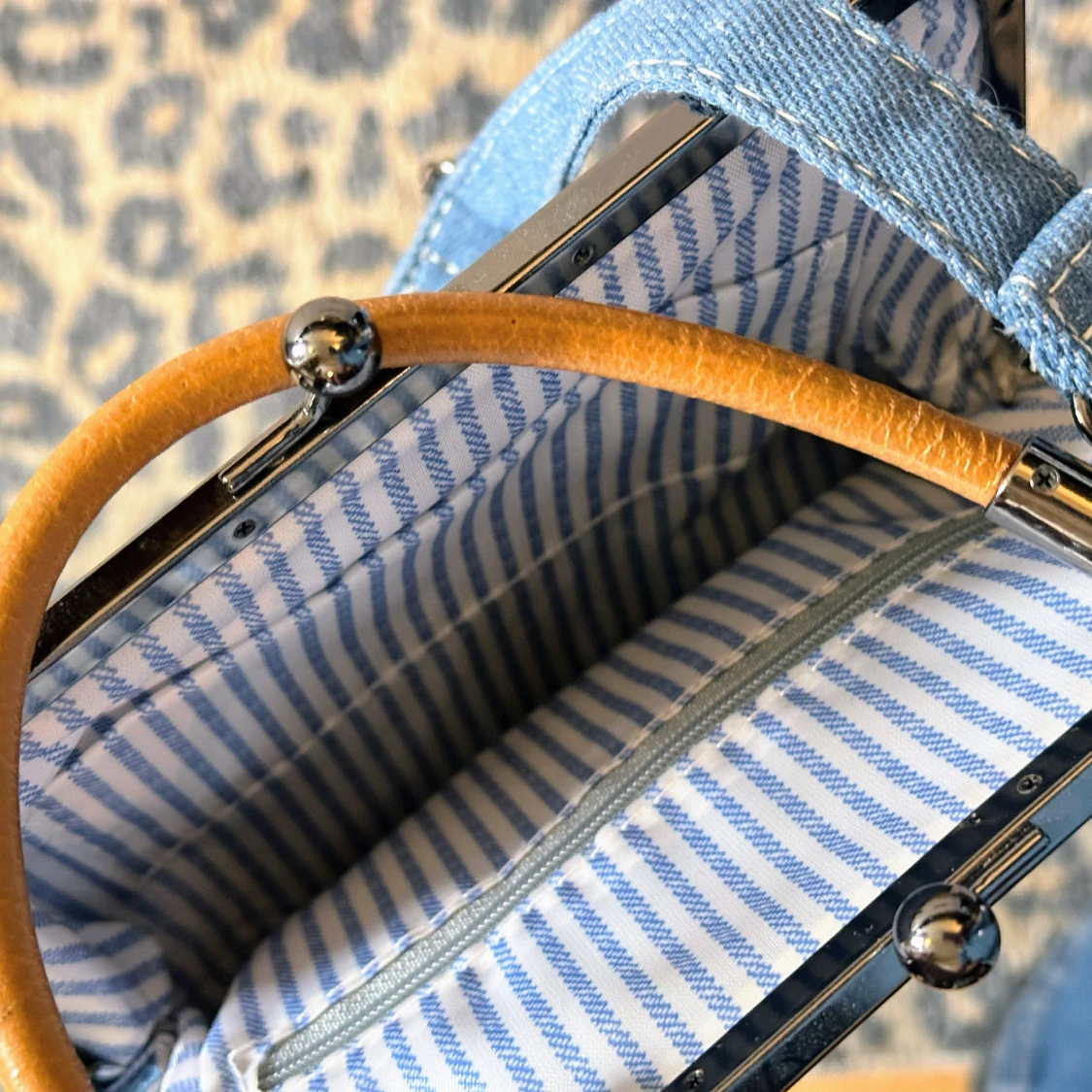 Jättesnygg blå denim handväska med ställbar axelrem och ett ljusbrunt läderhandtag Väskan stängs & öppnas med ett snäppspänne Den har ett fint blå/vitt randigt innerfoder med ett stort fack och ett litet fack med dragkedja Som ny i jättefint skick! Mått: H21,5/B23 cm