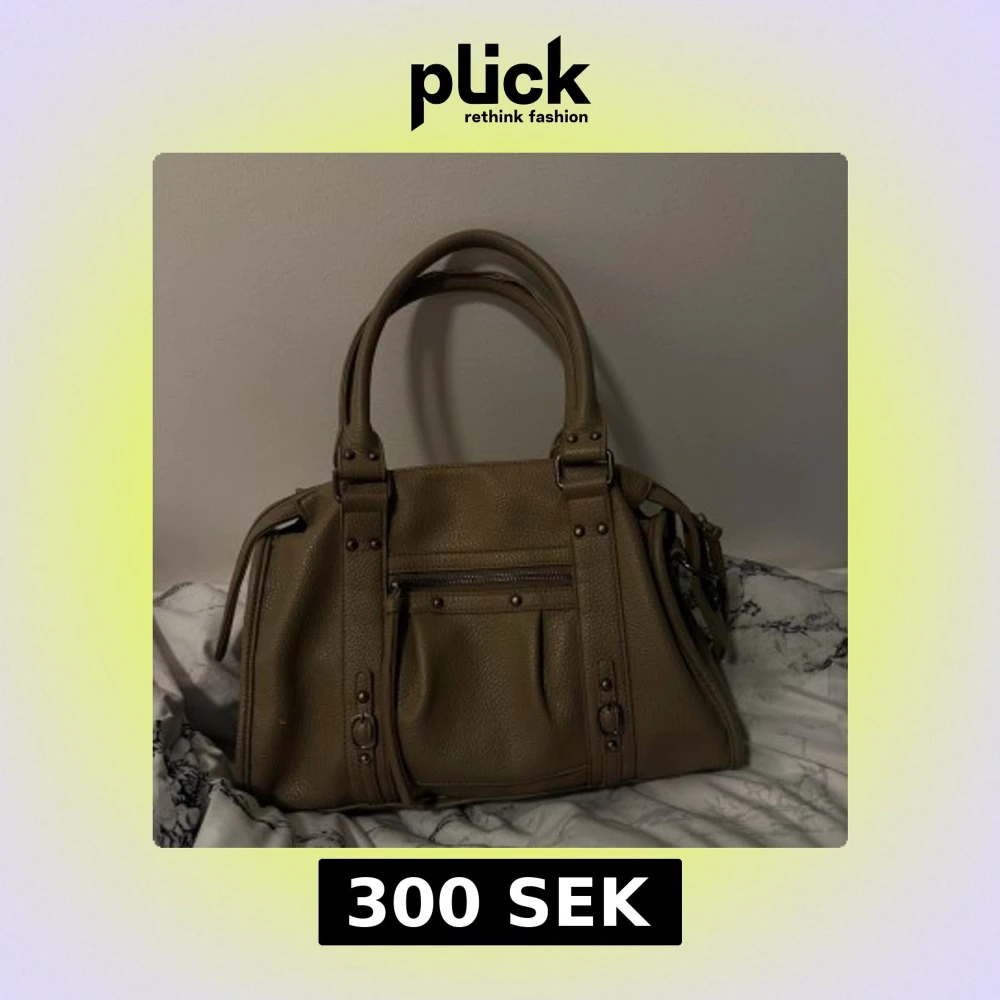 Snygg beige/khaki färgad handväska/axelväska i skinn med dubbla handtag och snygga metalldetaljer. Väskan har dragkedja upptill, litet ytterfack med dragkedja och dekorativa spännen framtill. Det finns stort utrymme inuti med två rymliga fack.Väskan har användes och kan ha lite svanker och tecken på användning men fyller fortfarande dess funktion. Och även tvättat den så gott jag kan.Finns en skavank på ena axel bandet. Nypris runt 1500kr. Mycket rymlig får plats med skolböcker medelstor dator
