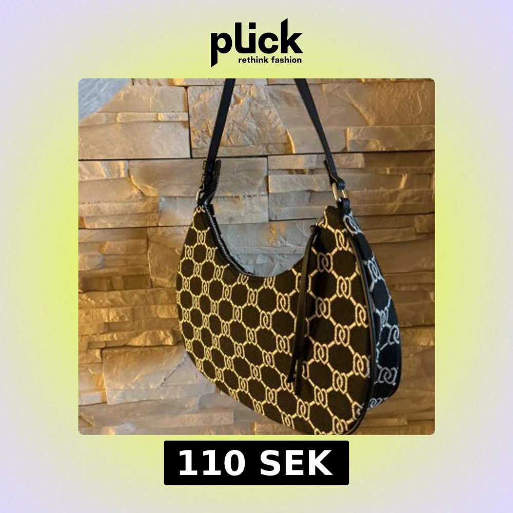 Snygg svart axelväska med vit kedjeliknande mönster över hela väskan. Väskan har en böjd form och ett kort axelband i svart. Stängs med dragkedja och är tillverkad i ett tygmaterial med struktur. Perfekt för dig som gillar trendiga accessoarer.