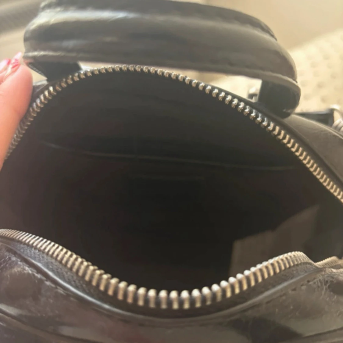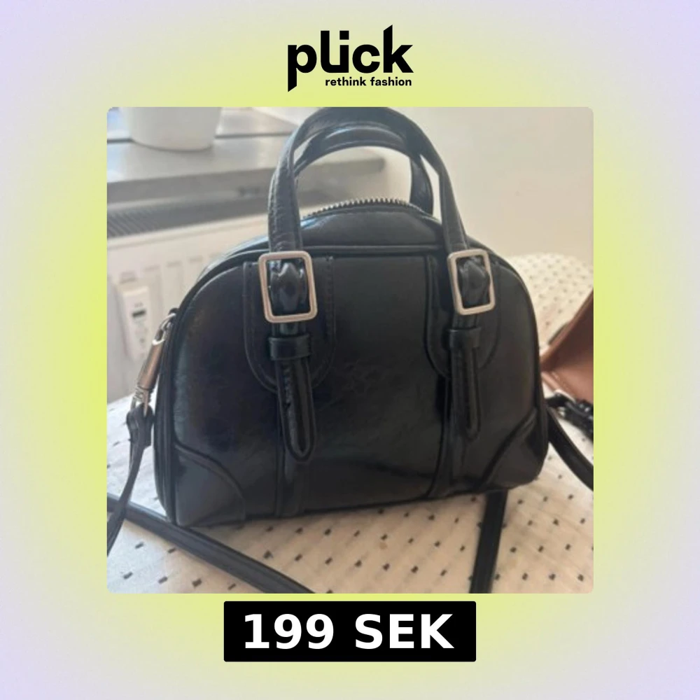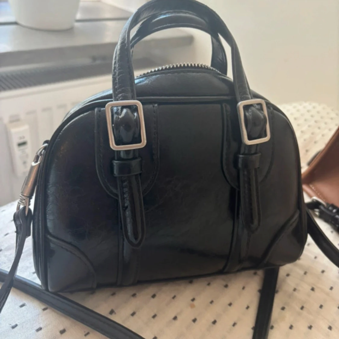 Snygg svart handväska i skinn med rundad form och två handtag. Perfekt storlek för det viktigaste. Inga defekter