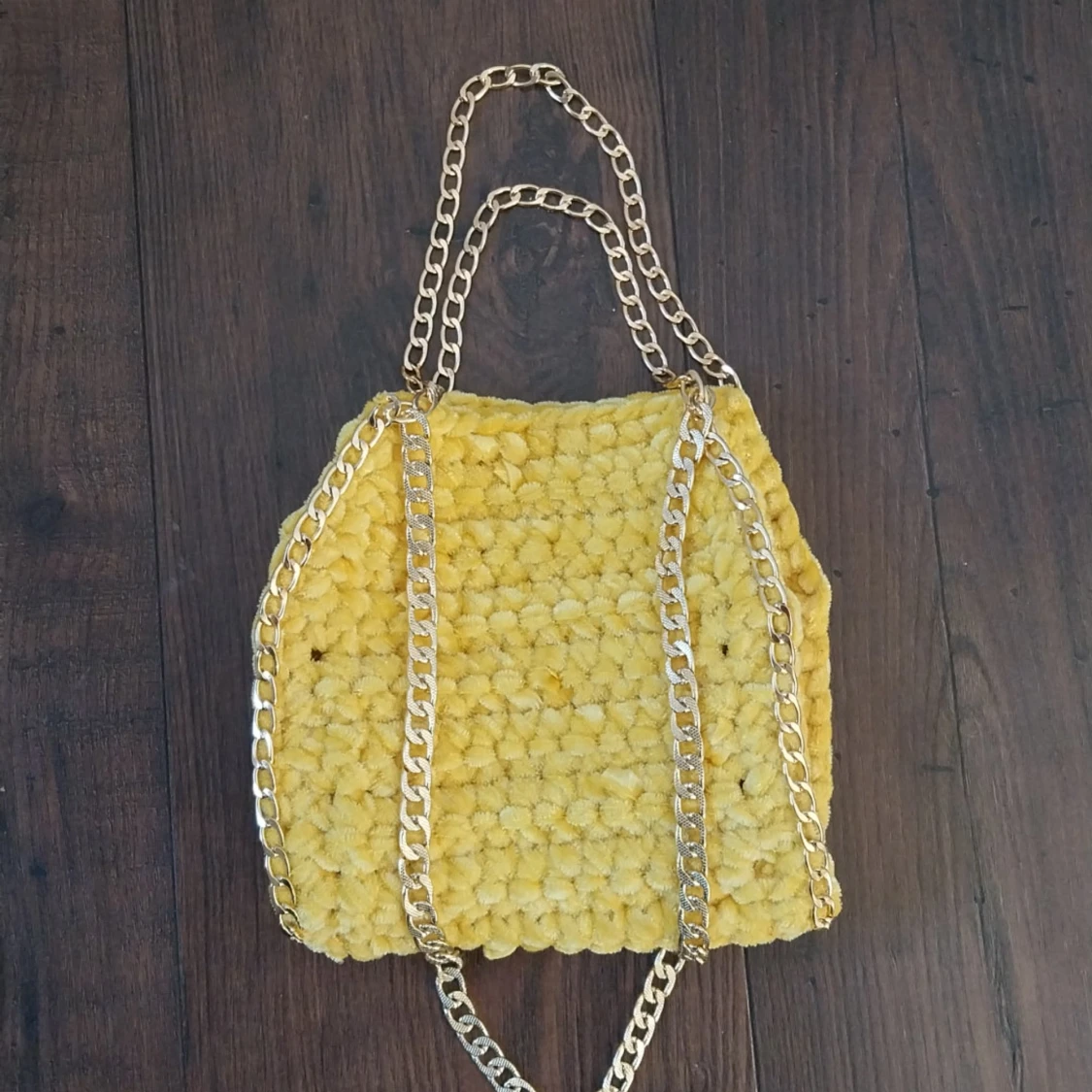 Snygg gul virkad väska med en glansig guldkedja. Väskan har en unik textur och är perfekt för att ge en färgklick till din outfit. Den är både trendig och praktisk med sin rymliga design.