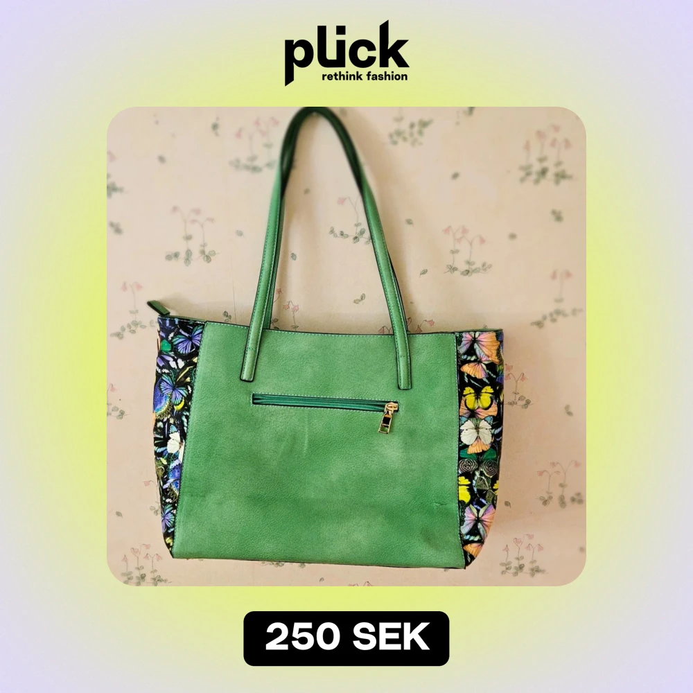 Grön handväska med fjärilar på sidan. Hel. Lite sliten på utsidan. Många fack. Böcker får plats i den. 250kr. Möts i gbg.