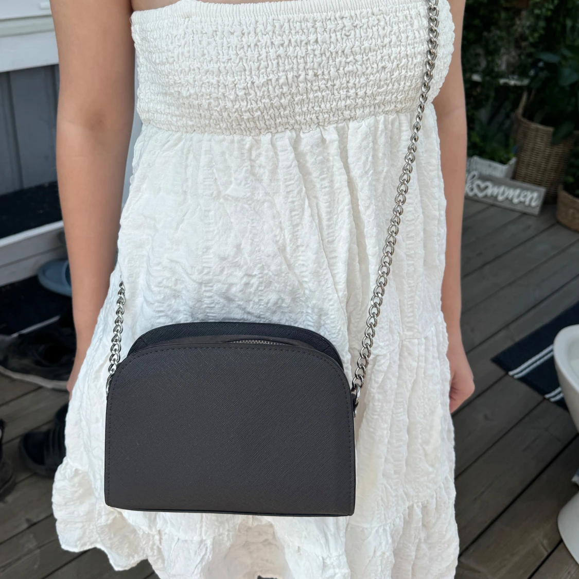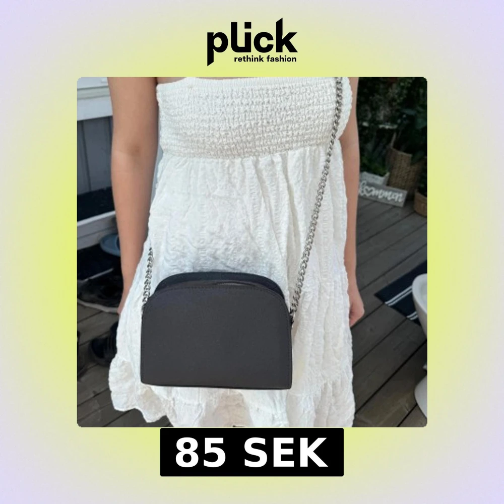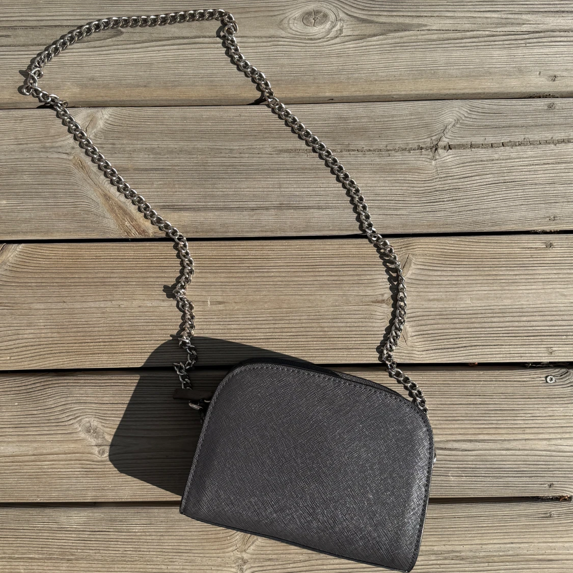 Snygg svart axelväska från H&M med stilren, rundad form och silverfärgad kedjerem. Väskan har diskret struktur i materialet och stängs med dragkedja upptill. Perfekt storlek för det viktigaste och passar till många outfits.