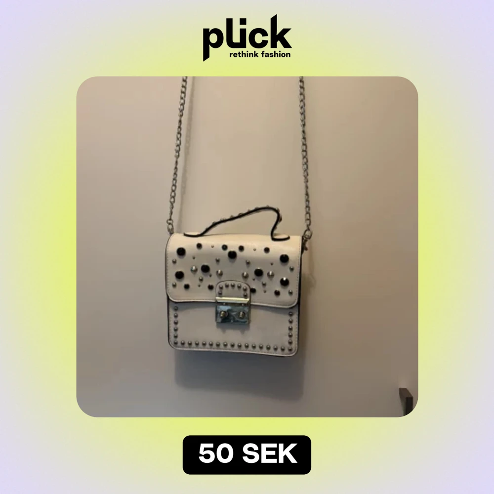 Vit liten väska med strass på. På baksidan är den lite missfärgad då den legat mot en annan svart väska.