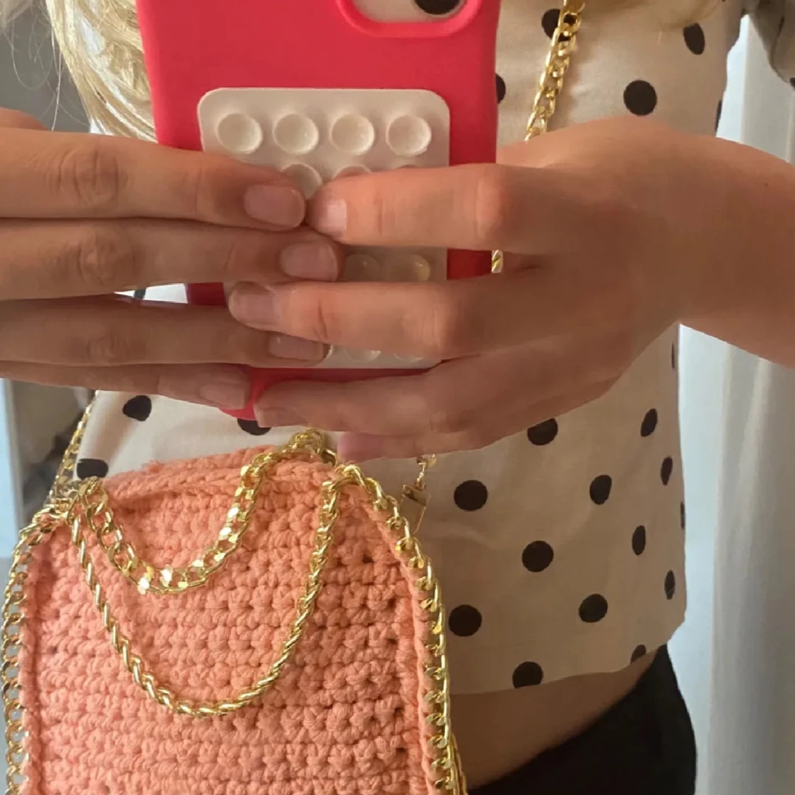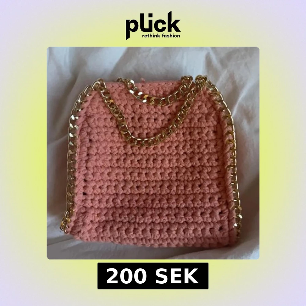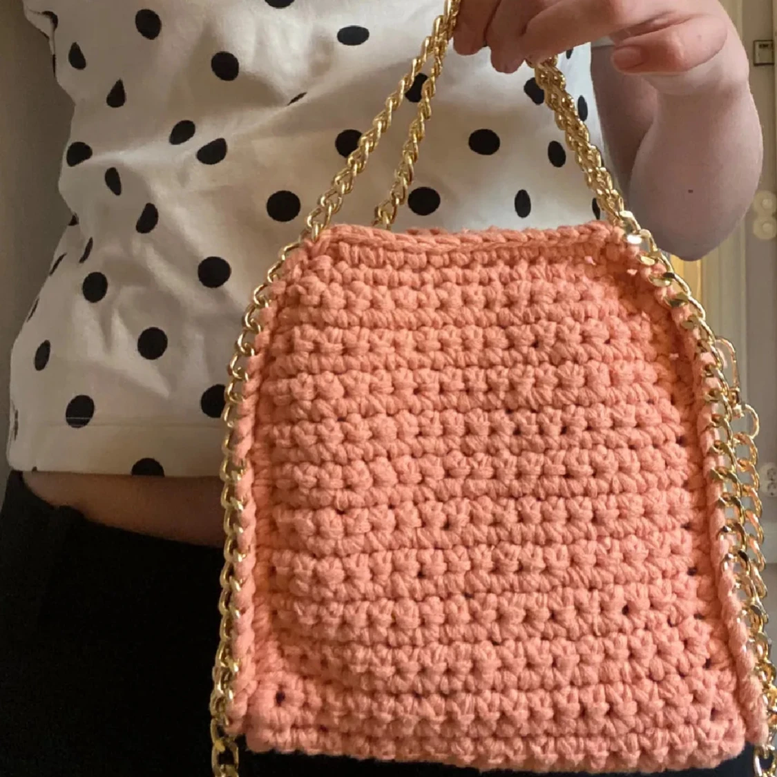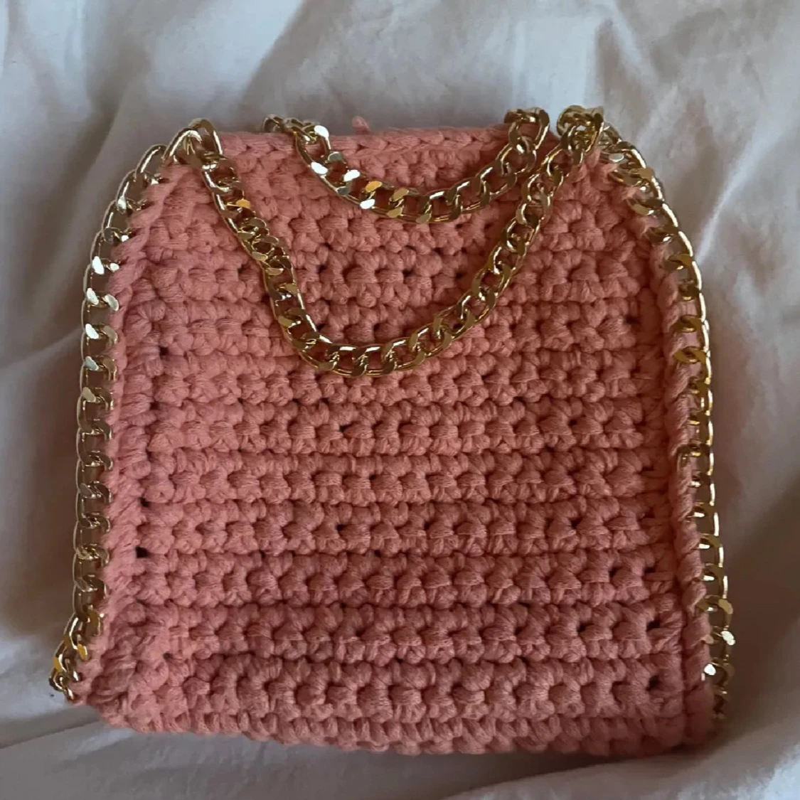 Superfin handgjord axelväska i virkad rosa bomull med chunky guldfärgad kedja som axelrem och detalj runt kanterna. Använd fåtal gånger.OBS bilderna är lånade från den jag köpte väskan av.