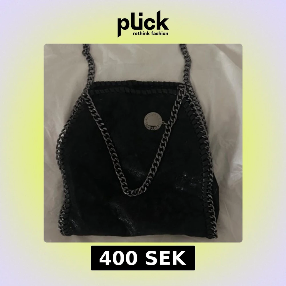 Säljer en svart axelväska som liknar en Stella McCartney med kedjedetaljer. Väskan har en rund metallbricka med en logga! Den har också en ficka på baksidan. Så fin!