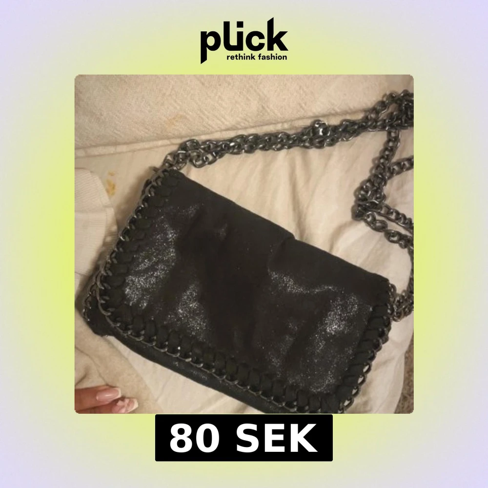 Säljer en svart axelväska med glittrig yta och dekorativa kedjedetaljer längs kanterna. Väskan har en rejäl kedjerem som ger en cool look och passar perfekt för att lyfta din outfit.