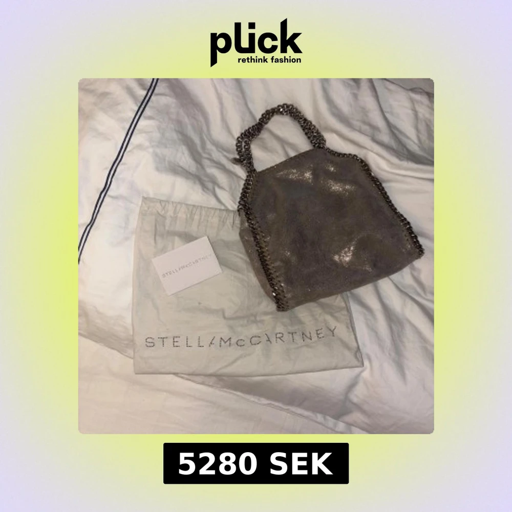 Snygg grå axelväska från Stella McCartney med glittrig yta och kedjedetaljer längs kanterna och handtaget. Väskan är i nyskick använd endast fåtal gånger kommer med kvitto , dustbag och lappar