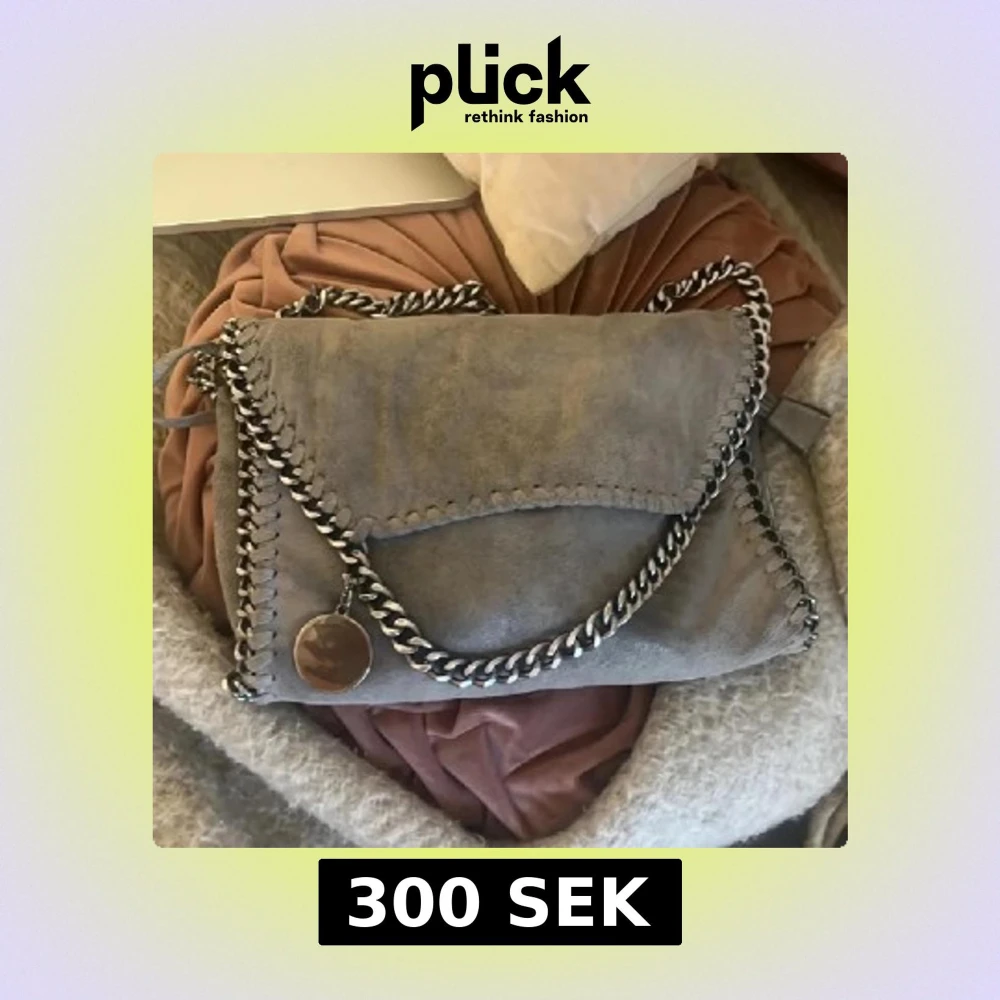 Stella McCartney liknande väska i mocka med silverfärgad kedja runt kanterna och som axelrem. Väskan har ett leopardmönstrat innerfoder och magnetlås.