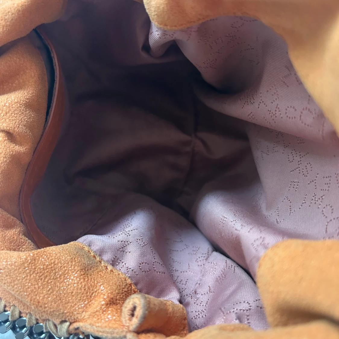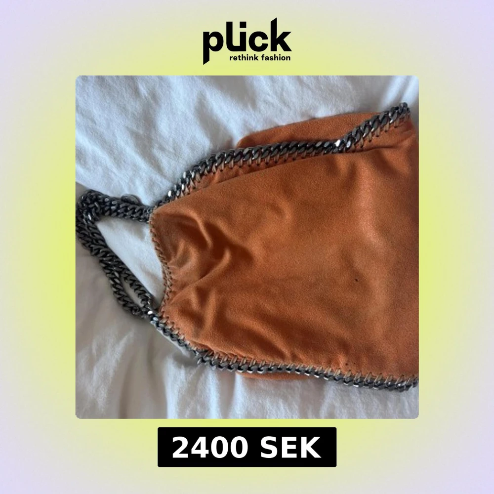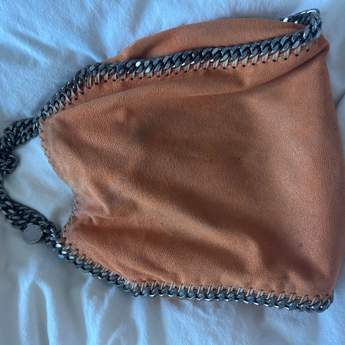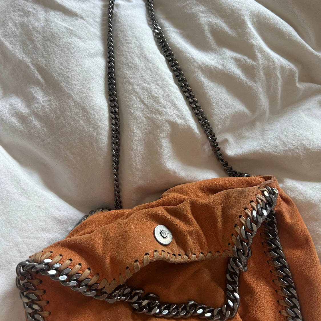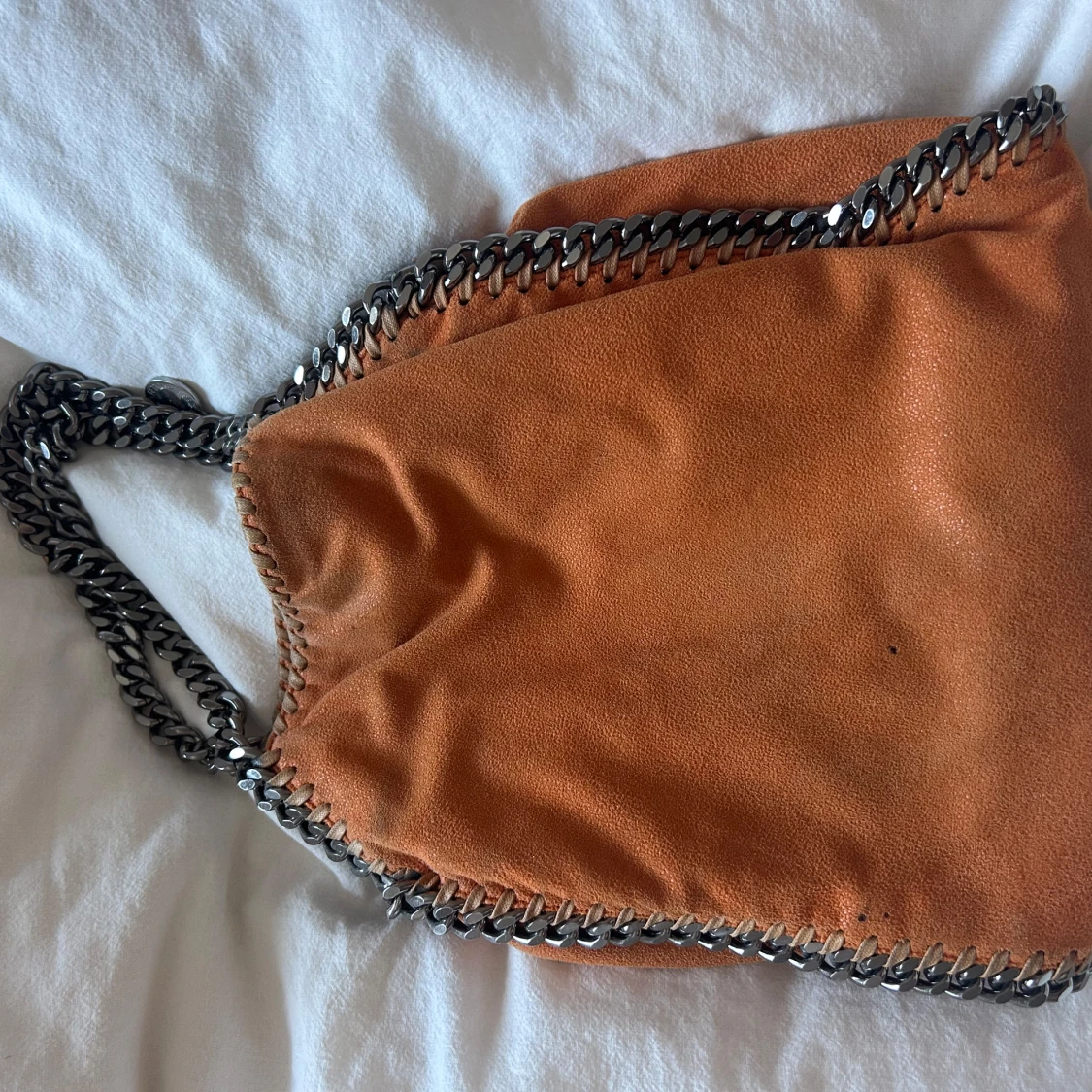 Cool orange axelväska från Stella McCartney med grova silverfärgade kedjor längs kanterna och som axelrem. Väskan är i mjuk mocka och har magnetlås. Insidan är fodrad med logotypmönstrat tyg och har en innerficka med dragkedja.
