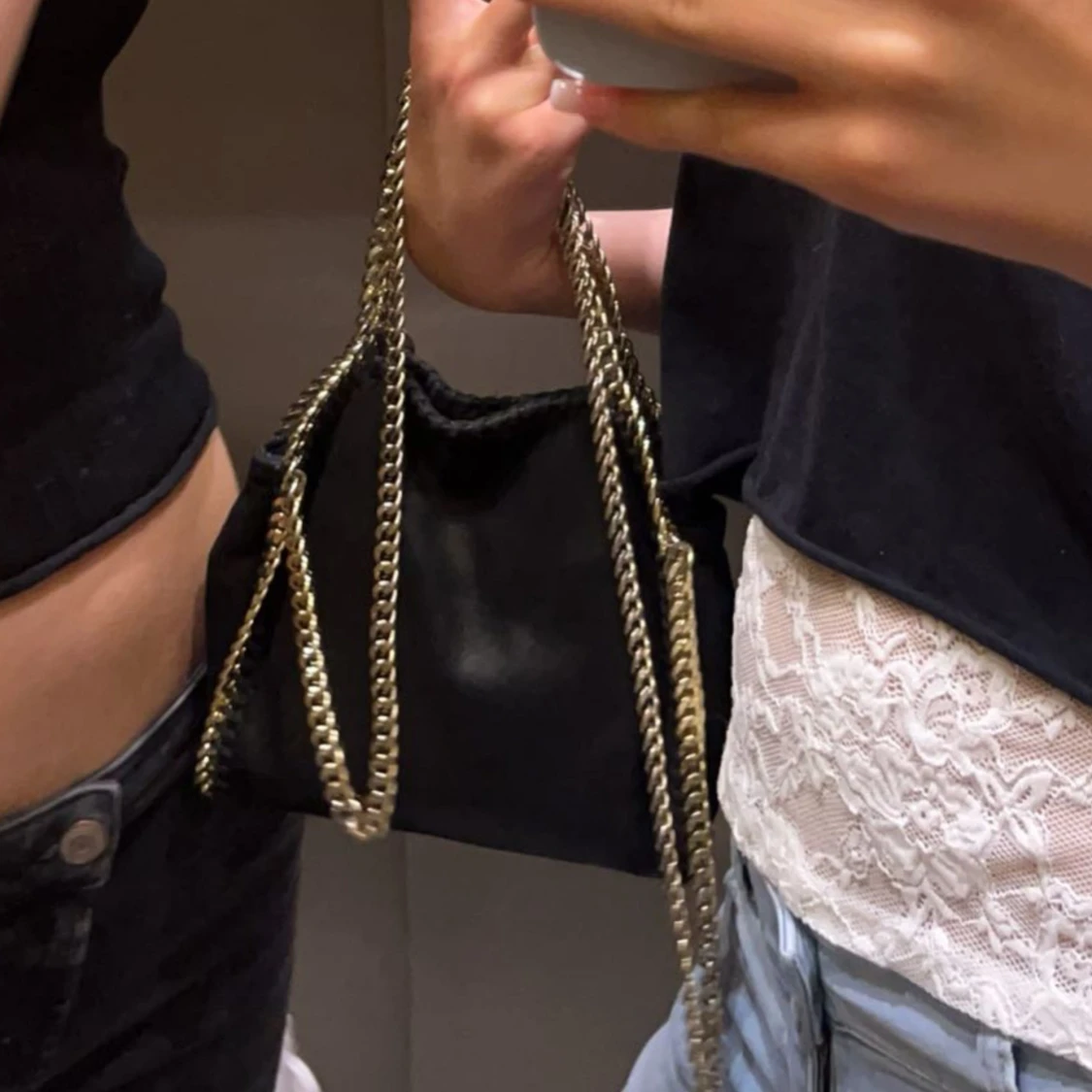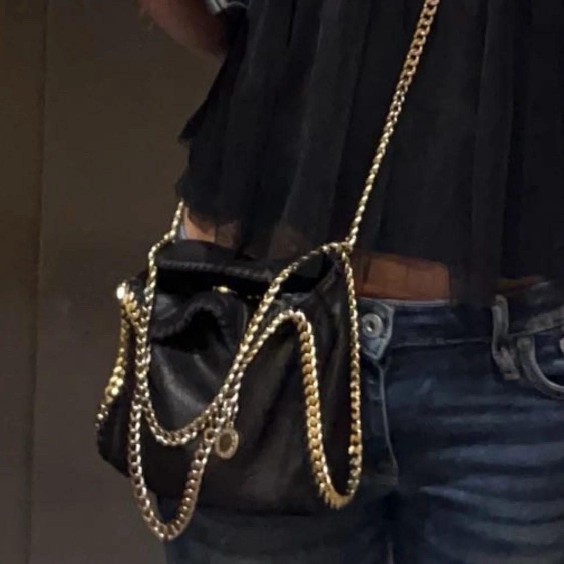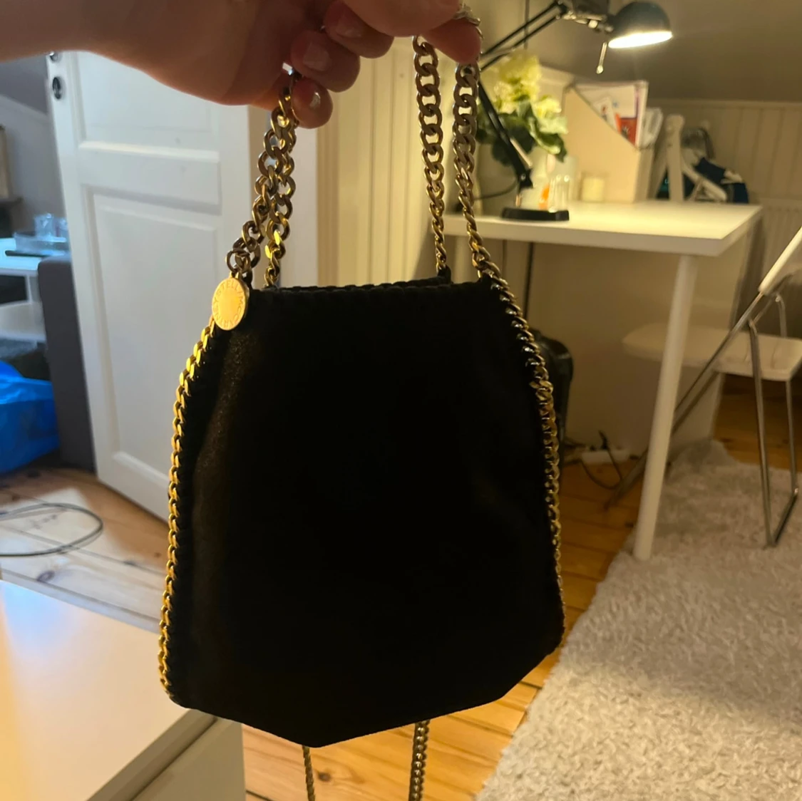Stella McCartney Tiny, svart med guldkedjor. En lång axel kedja och en kort. Defekter som att kedjorna har tappat lite färg och en liten skråma på lädret, där av priset. Kvitto och dustbag tillkommer, skriv för fler bilder och frågor.🥰❤️(skriv gärna innan ni köper💖)