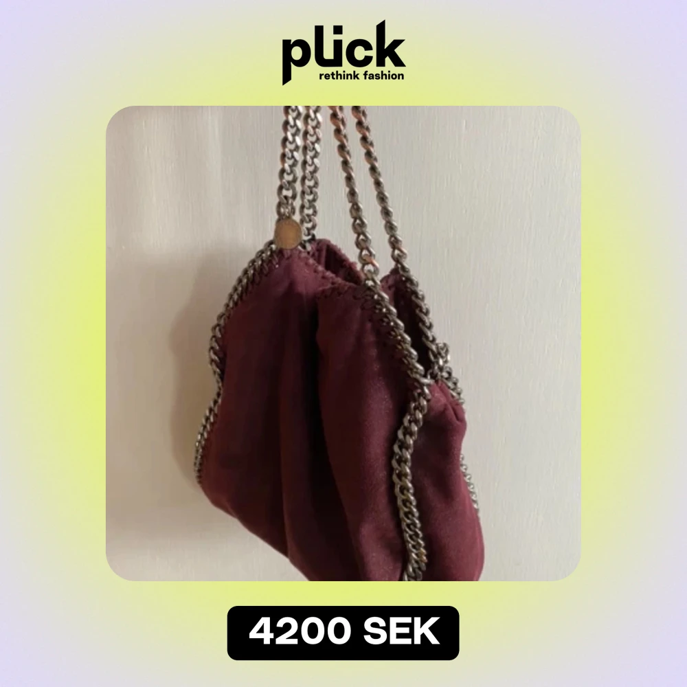 Säljer min vinröda Stella McCartney väska. Köpt för ca ett år sedan här på Plick. Väskan har några få defekter såsom lite rostiga kedjor men är annars skonsamt använd. Väskan kommer med en dustbag.💛 Skriv vid fler frågor eller för fler bilder!