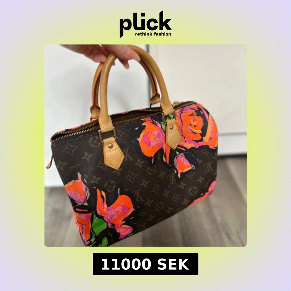 Snygg handväska med ett klassiskt monogrammönster och färgglada blommor i rosa, orange och grönt. Väskan har bruna handtag och en dragkedja upptill. Perfekt för att ge en färgklick till din outfit! Handväskan från 2008 Äkta!