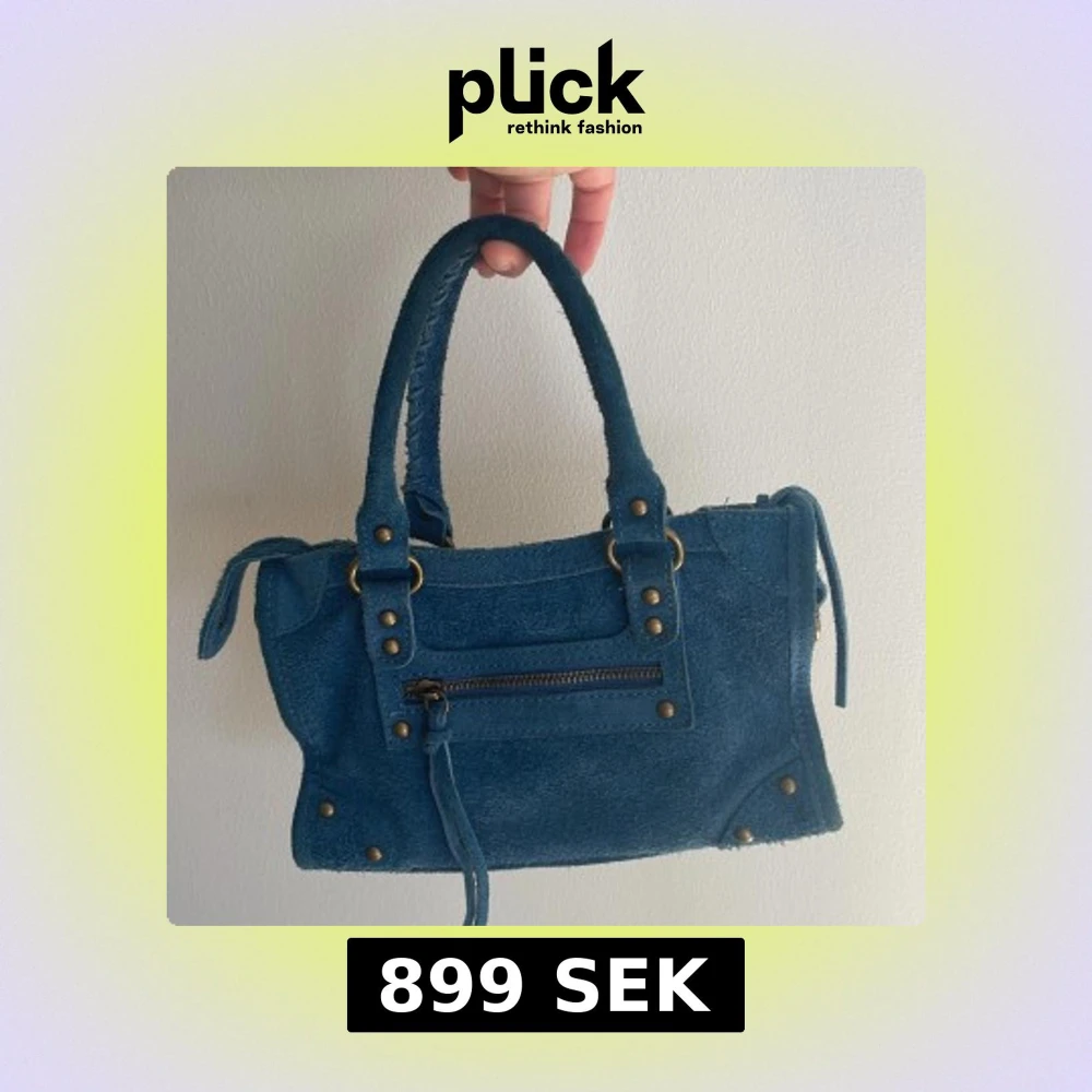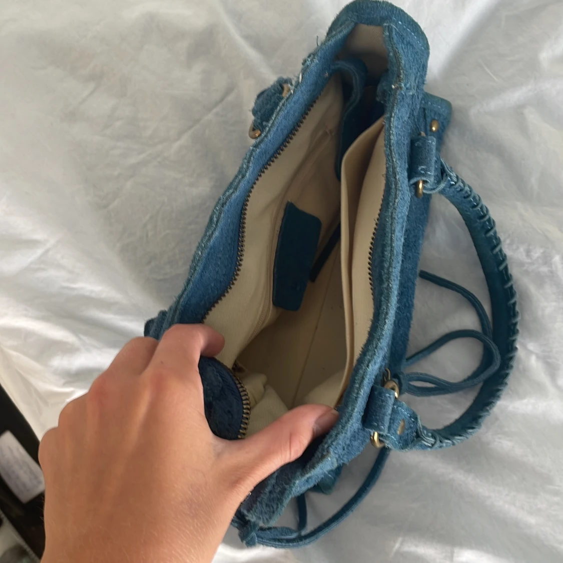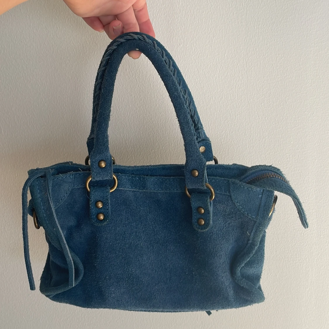 Snygg blå handväska i mocka med coola metalldetaljer och dragkedja framtill. Väskan har två handtag med flätad look och två fack inuti där man får plats med mycket! Jag köpte väskan för 1500kr på lyckliga jag, men har bara använt den 2-3 gånger.