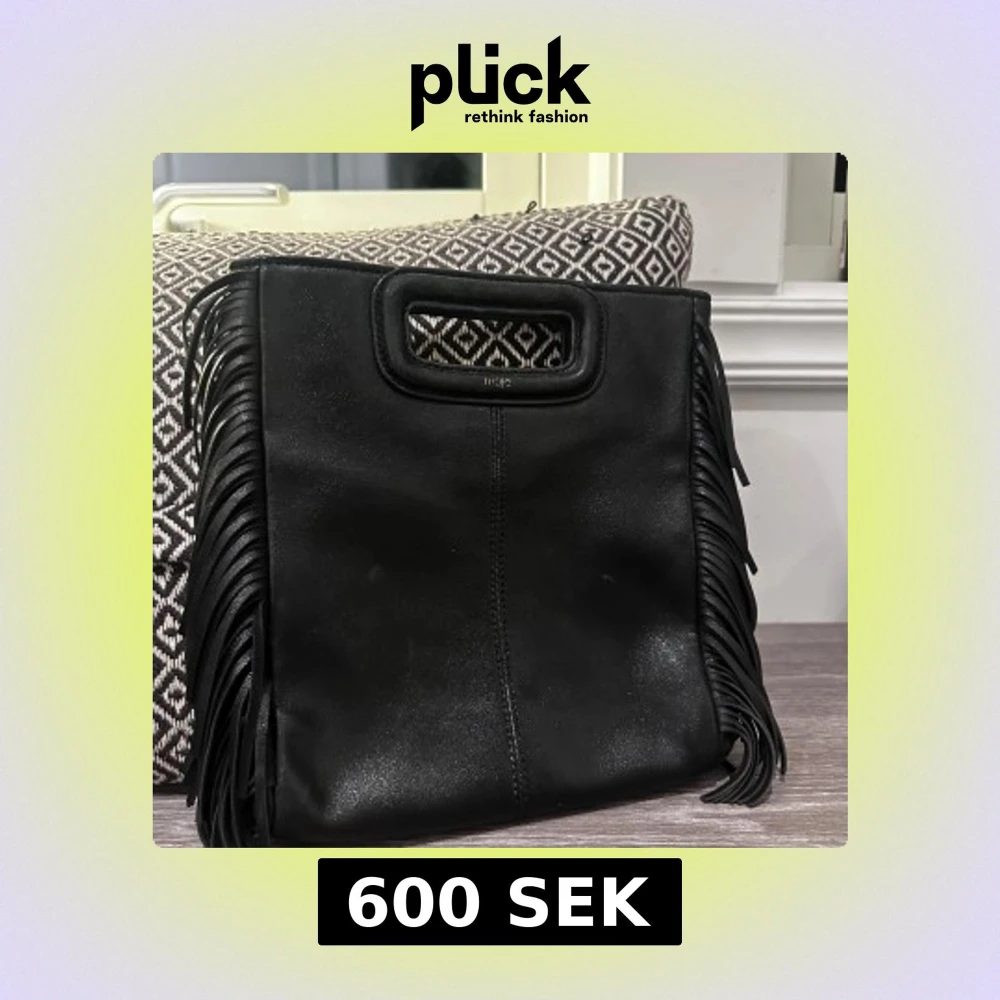 Snygg svart majevĂ€ska i skinn med fransar pĂ„ sidorna. Den Ă€r ganska sliten men upputsad, axelbandet medföljer ocksĂ„đFler bilder gĂ„r att fĂ„!