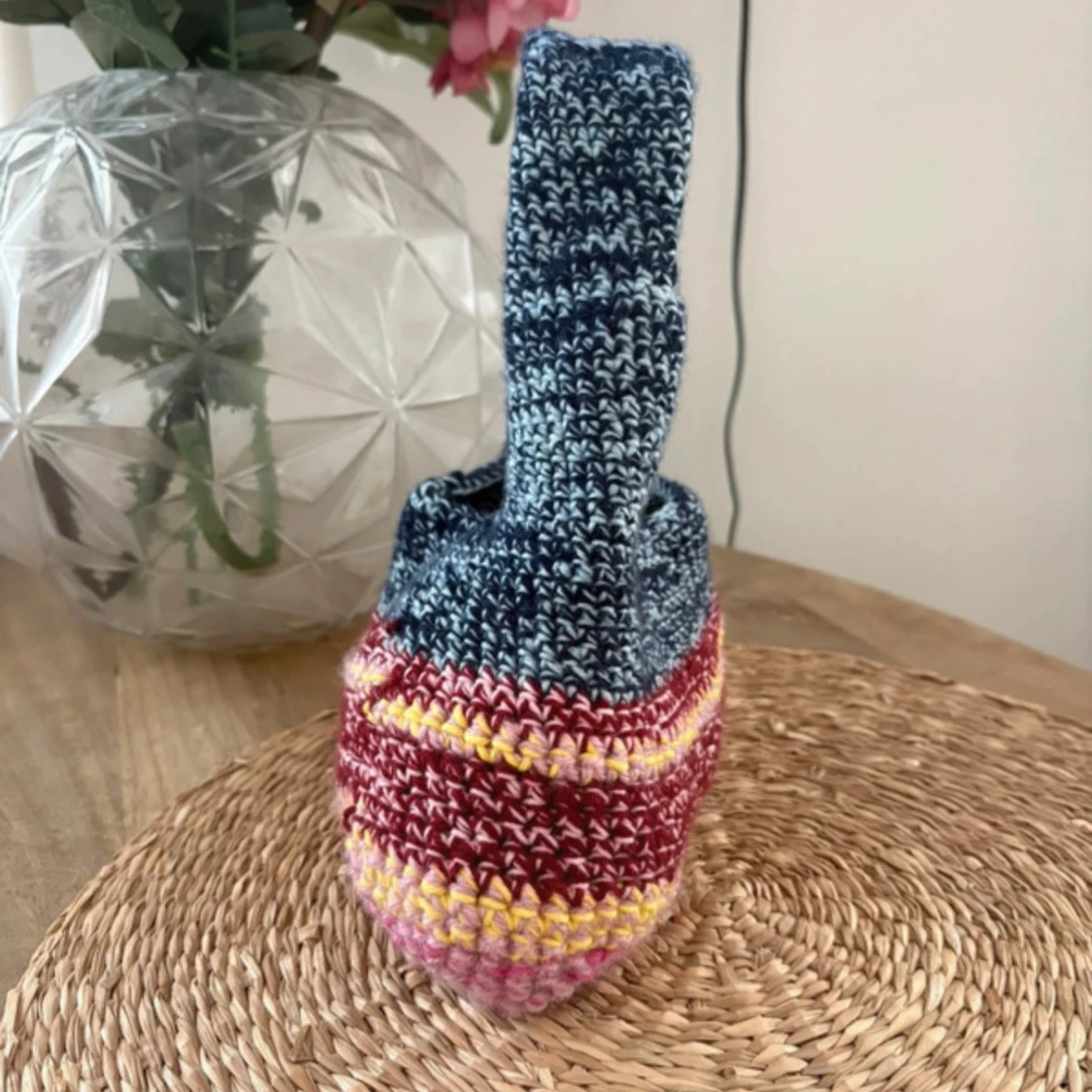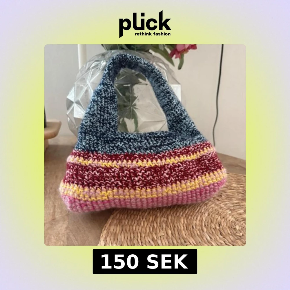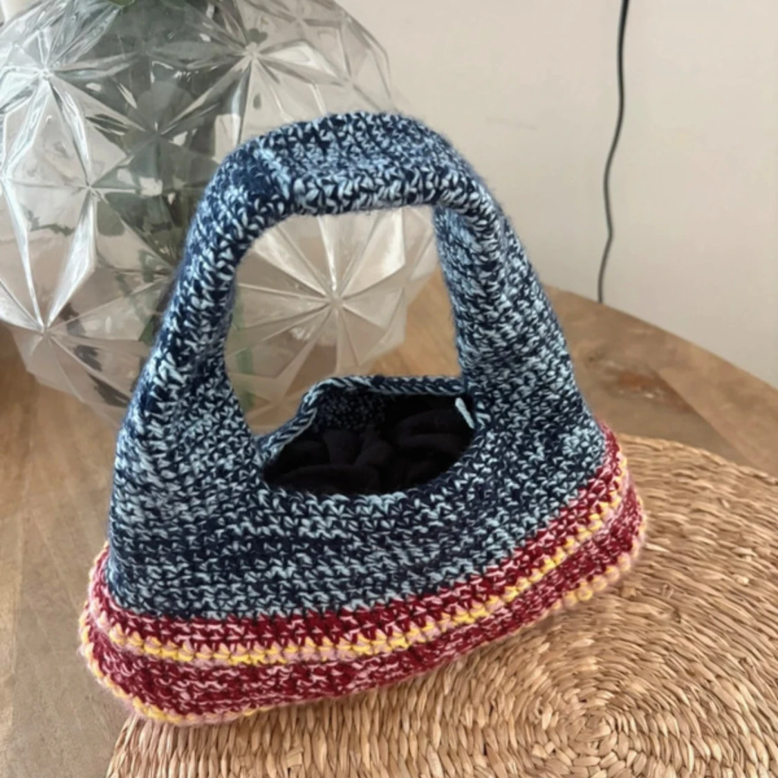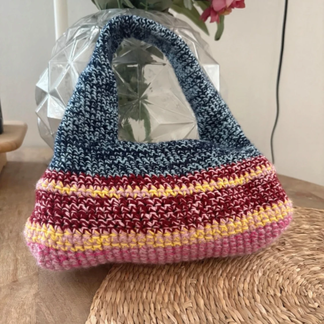 Unik stickad handväska i blått, vinrött, gult och rosa. Väskan har en mjuk, rundad form och ett brett handtag. Perfekt för dig som vill ha en personlig accessoar med retrovibbar. Väskan är handgjord och har ett coolt randigt mönster.