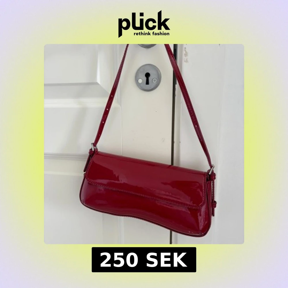 Säljer en snygg röd axelväska med glansig lackad yta och stilren design. Väskan har en smal axelrem och en mjukt böjd form, perfekt för att lyfta vilken outfit som helst. Enkel att matcha och ger en cool retrovibe.