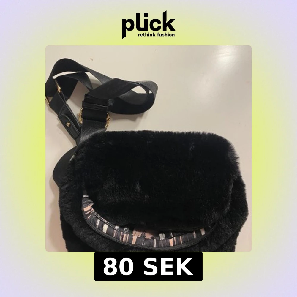 Snygg svart axelväska med mjuka pälsdetaljer och guldfärgade metalldetaljer. Väskan har ett justerbart band, dragkedja bak och ett coolt mönstrat innerfoder i rosa och svart. Perfekt för dig som vill sticka ut med en unik accessoar.