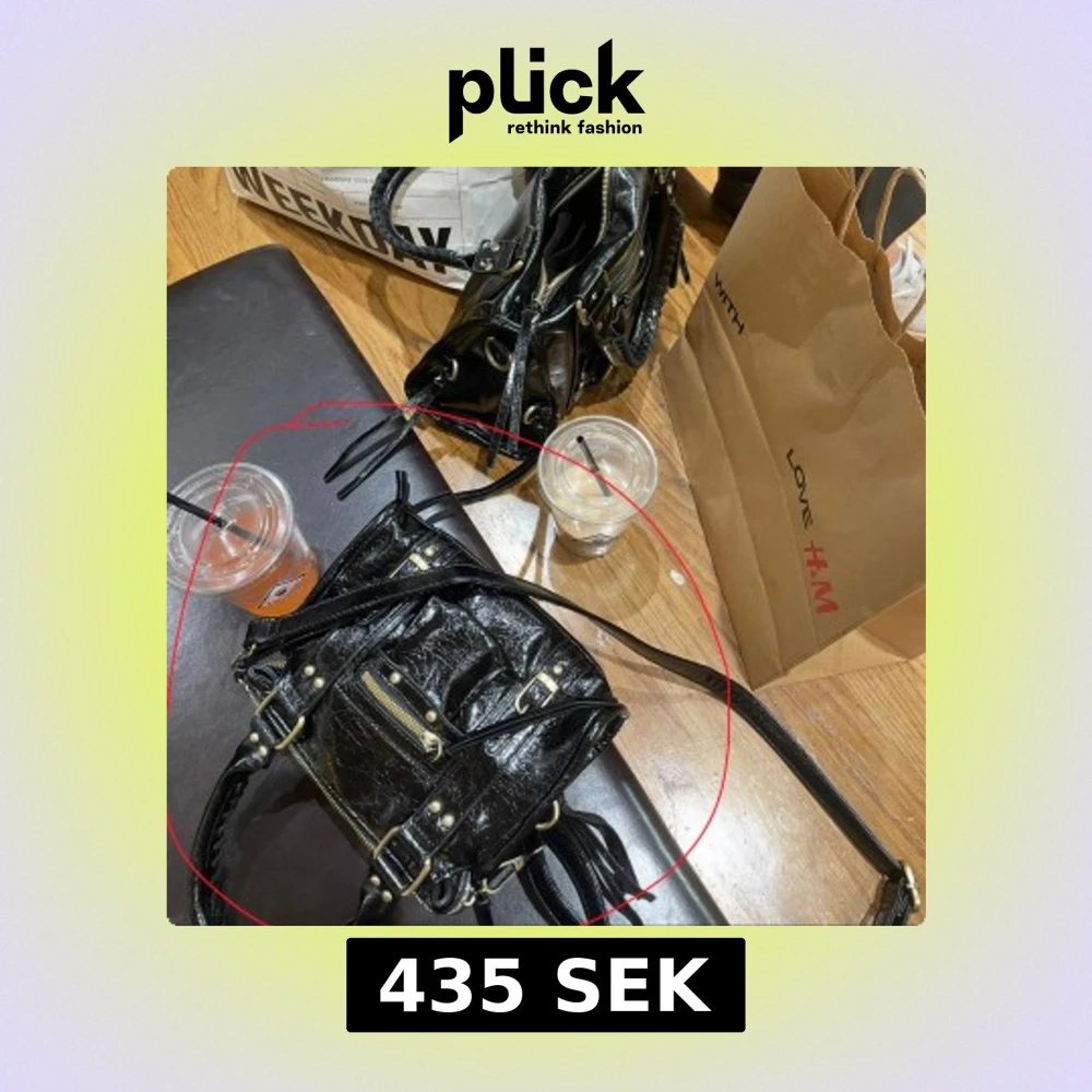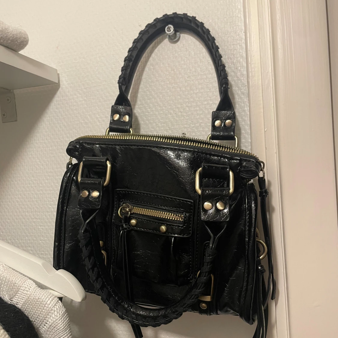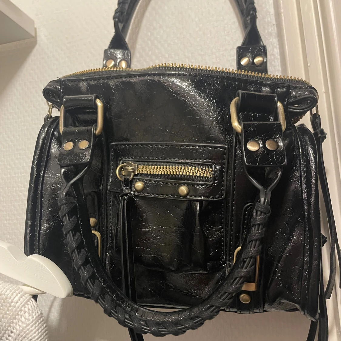Snygg svart handväska med glansig finish och coola metalldetaljer. Väskan har både handtag och axelrem, samt flera dragkedjor och nitar som ger en edgy vibe. Perfekt storlek för att få plats med allt viktigt och passar till många olika stilar. Skriv för fler bilder! Priset går att diskutera. !!säljer den som är in ringad!!❤️