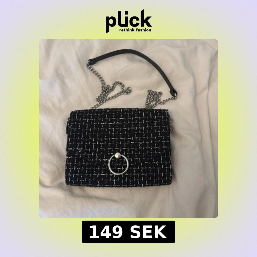 Stilren svart axelväska i rutigt tyg med silverfärgad kedjerem och en snygg ringdetalj på locket. Väskan har ett mjukt innerfoder och stängs med magnetknapp. Perfekt storlek för mobil och småsaker, och ger en cool touch till din outfit.