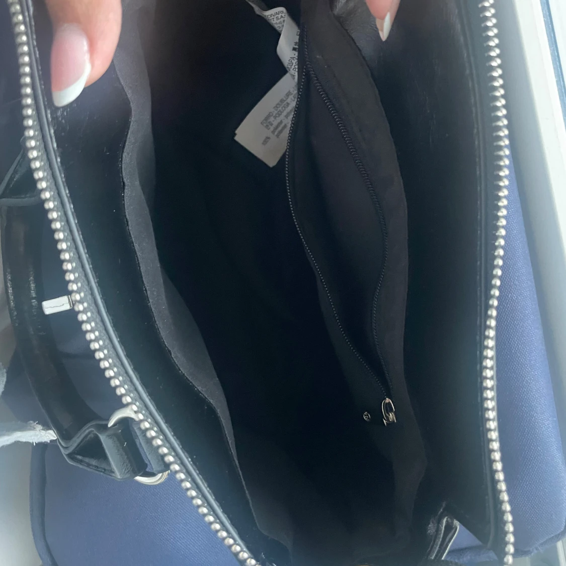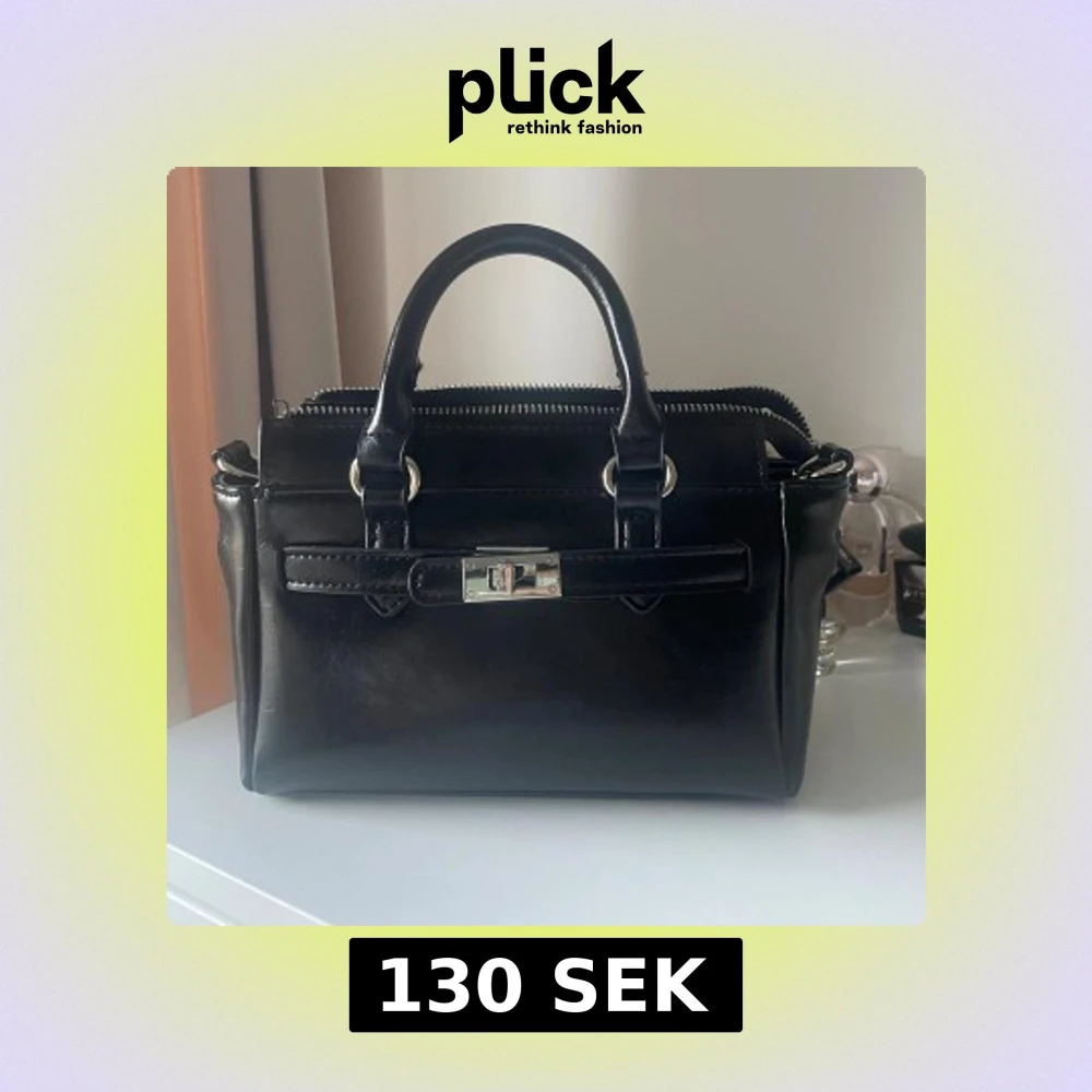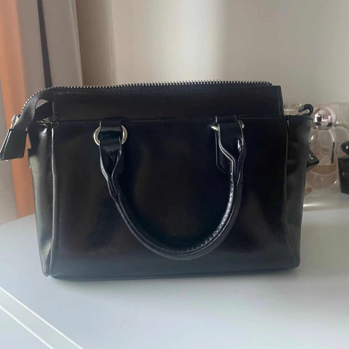 Stilren svart handväska ifrån Zalando i skinn med två handtag, silverfärgad dragkedja och snyggt spänne framtill. Väskan har flera fack inuti, inklusive ett med dragkedja, perfekt för att hålla ordning på dina grejer. Klassisk och tidlös design som passar till det mesta.
