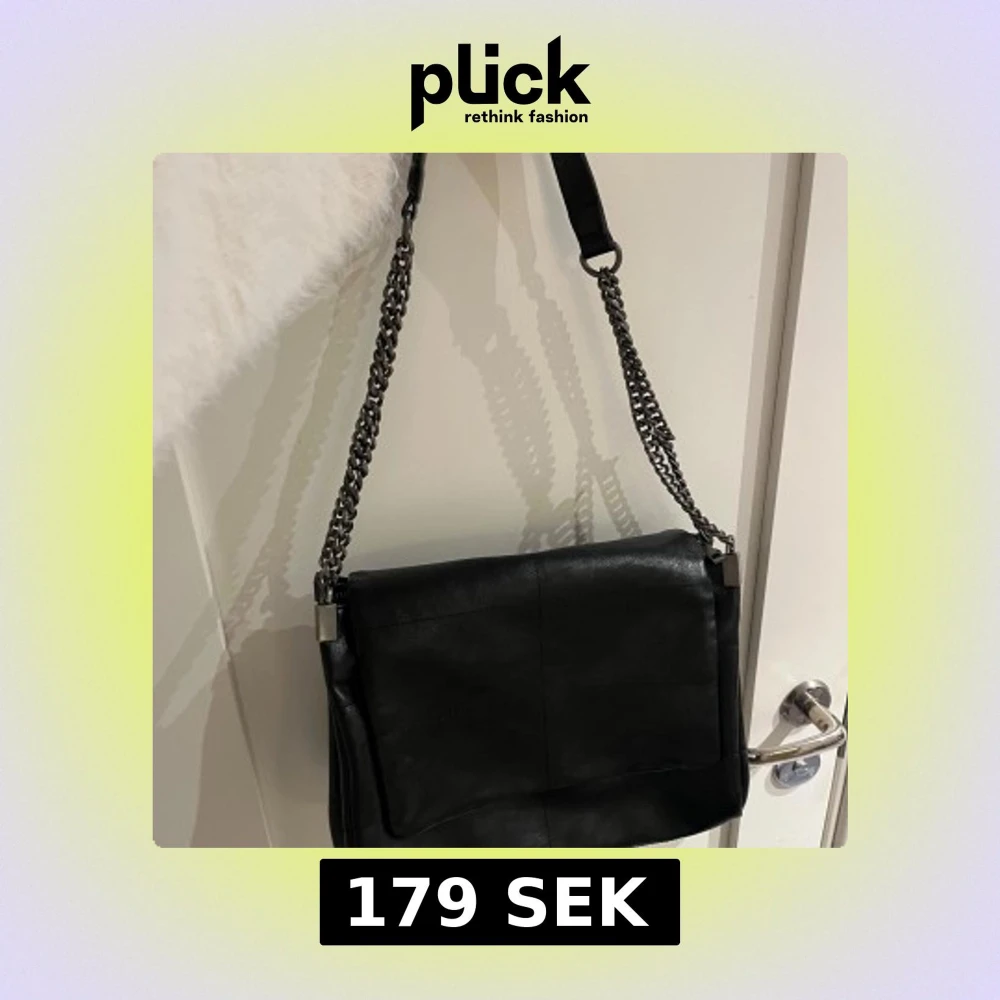 Snygg svart axelväska i skinn med kedjedetaljer på axelremmen. Väskan har flera fack med dragkedja för praktisk förvaring. Perfekt för en stilren look.