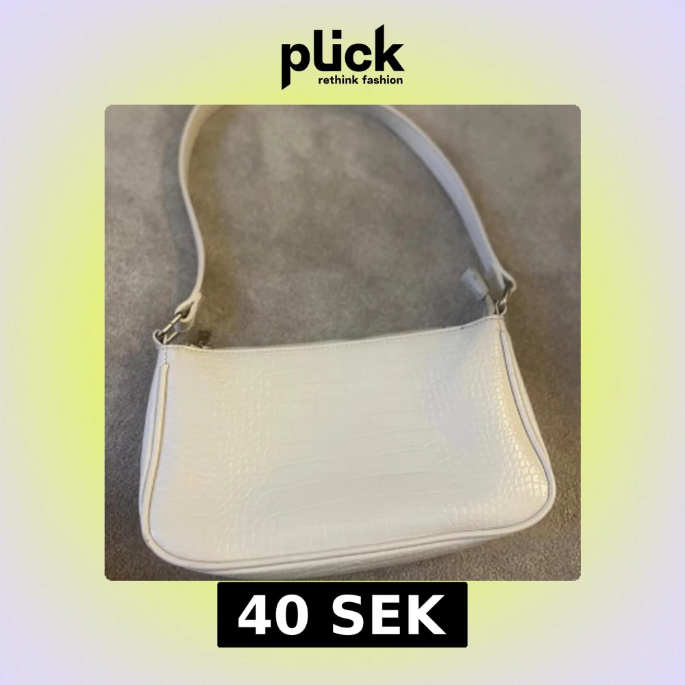 Snygg vit axelväska med croco-mönstrad yta och silverfärgad dragkedja. Väskan har en stilren, rektangulär form och ett rymligt svart innerfoder med extra fack och dragkedja. Från Ullared.