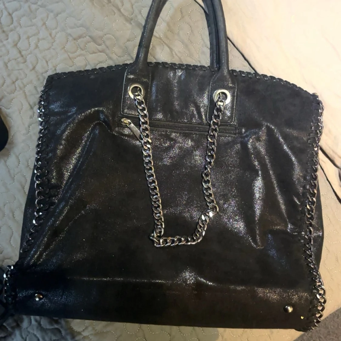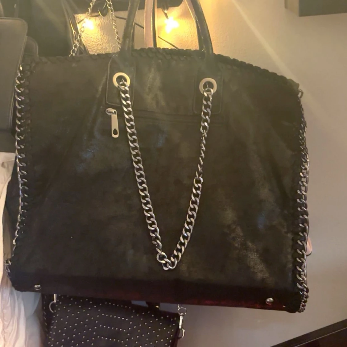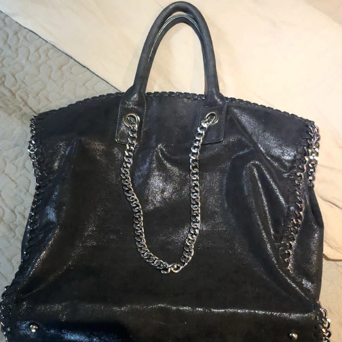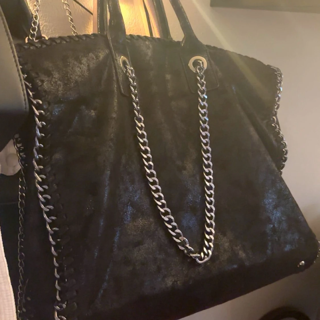 Snygg och rymlig svart axelväska med glansig finish och coola silverfärgade kedjor som axelrem. Väskan har handtag upptill, dekorativa sömmar längs kanterna och dragkedja på baksidan. Perfekt för dig som gillar statement-accessoarer. Användt mycket sällan och därför säljer jag den. :)