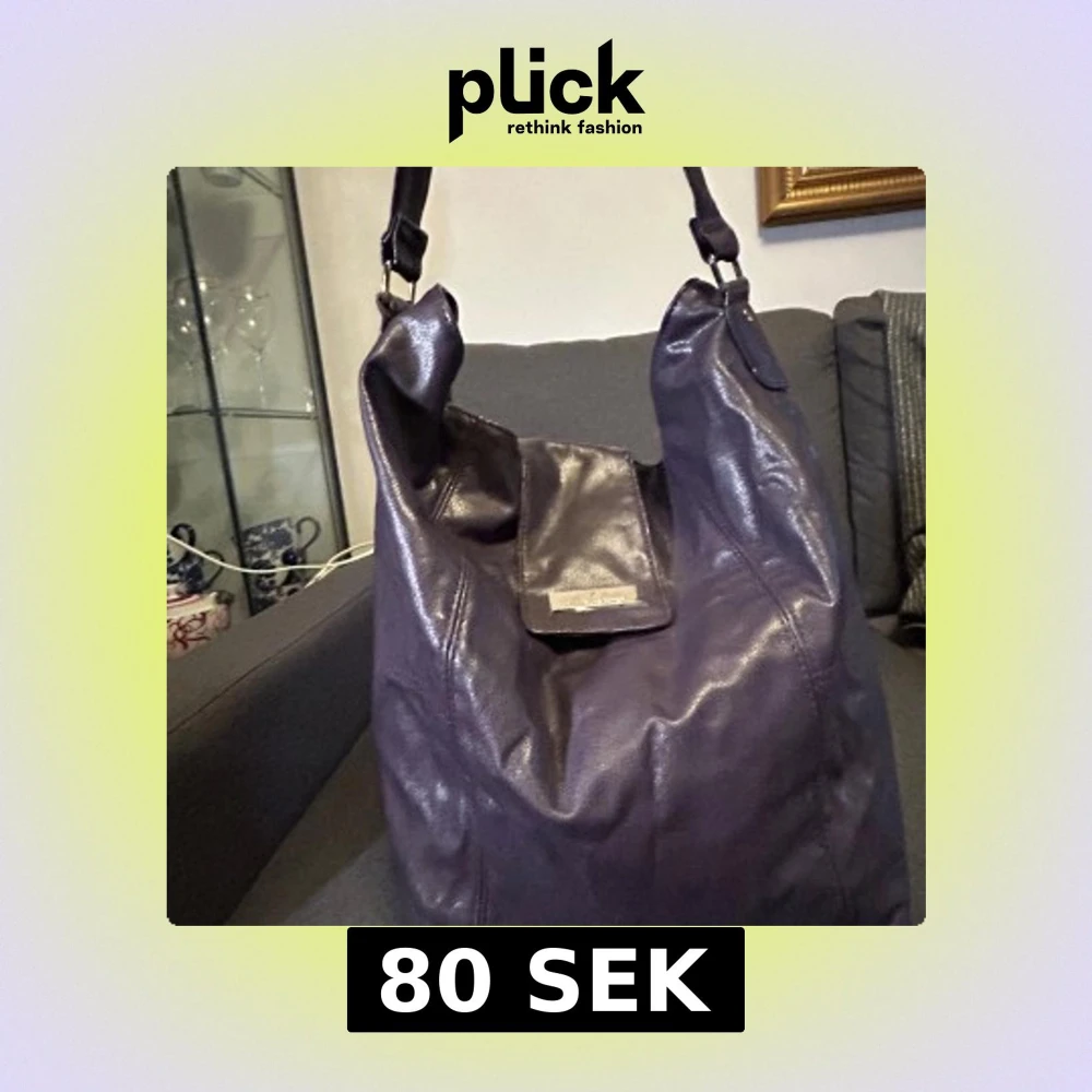 En lila axelväska med stort huvudfack, dragkedja och innerfickor. Finns slitage, se bilder. Storlek: ca 33x30x12