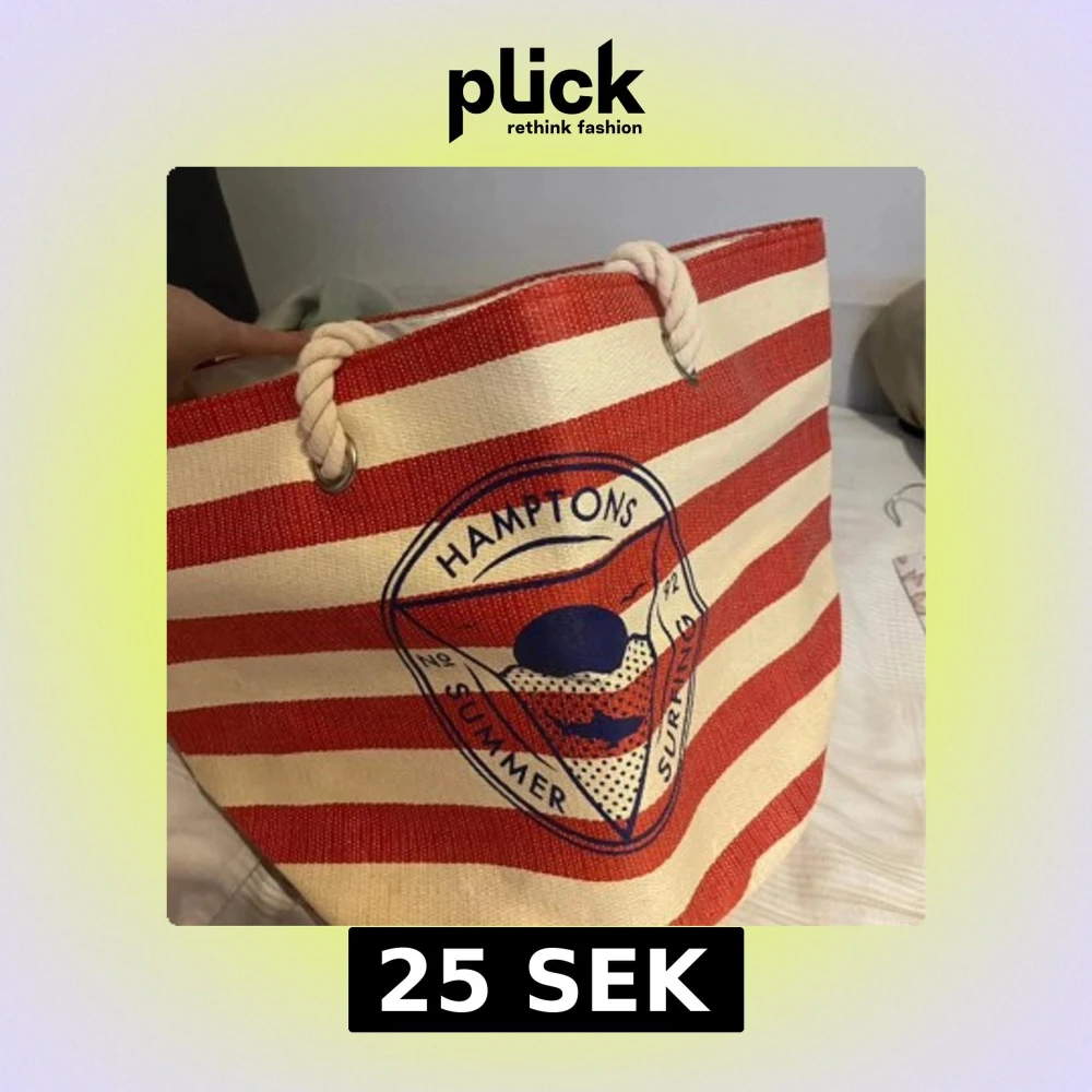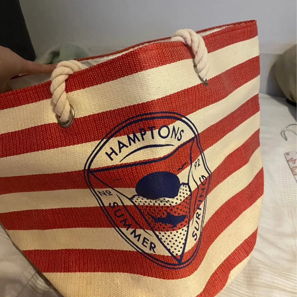 Stor och rymlig strandväska med röda och vita ränder, grova rep-handtag och tryckt Hamptons-motiv framtill. Perfekt för stranden eller sommarens äventyr. Tillverkad i slitstark textil med marint inspirerad design. Köpt från stadium med prislapp.