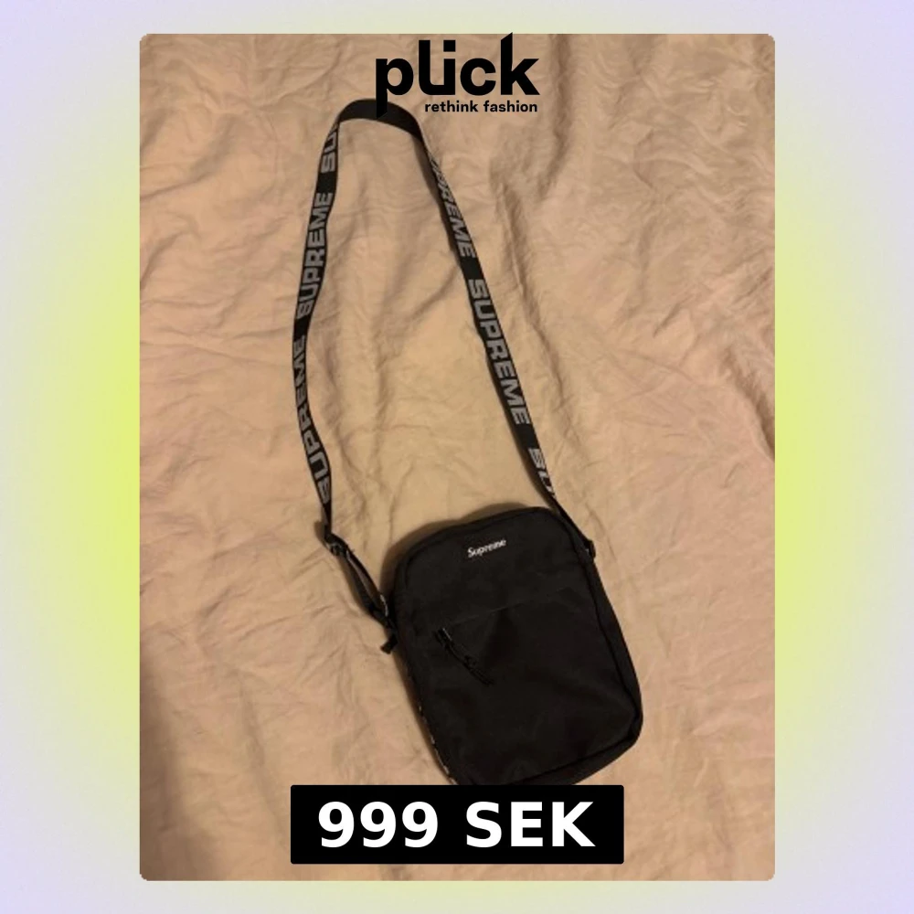 Supreme axelväska i svart Cordura-material med justerbar rem där Supreme-loggan är tydligt broderad. Väskan har en dragkedja framtill och en kompakt, fyrkantig form. Perfekt för att bära dina essentials och ge din outfit en streetwear-vibe.