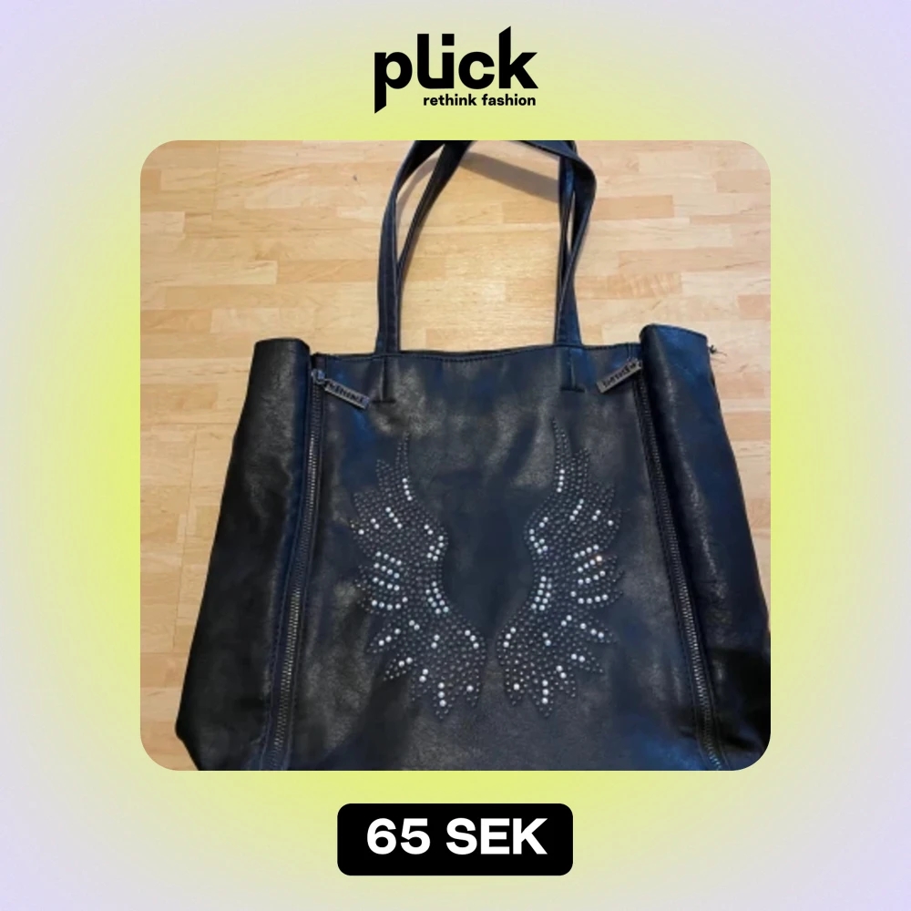 En svart axelremsväska med paljetter i form av vingar på framsidan. Den går att stänga med dragkedja. Dragkedjorna på fram och baksidan går att dra ner men gör inte väskan större.Väskan är 36 cm hög och 39cm bred.
