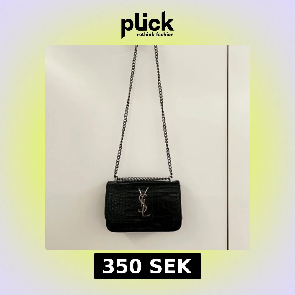 Säljer en svart axelremsväska med krokodilpräglat mönster och silverfärgad kedja. Väskan har en logga framtill och är perfekt för att lyfta vilken outfit som helst. Kan användas som handväska också. Väskan är köpt utomlands, den är inte äkta. Priset kan diskuteras.