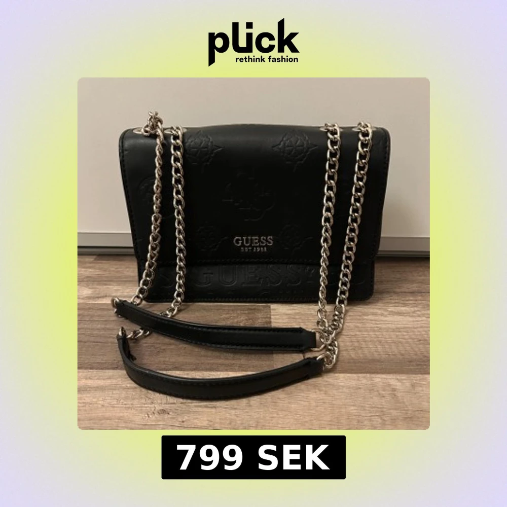 Svart axelremsväska med präglad logga och silverfärgad kedja som axelrem från Guess. Väskan har flera fack, magnetlås och en dragkedja på baksidan. Observera att det förekommer ytterst små fläckar på väskan som nog går att ta bort och är inget som påverkar väskans funktion, se bilderna. Annars är väskan i mycket bra skick.