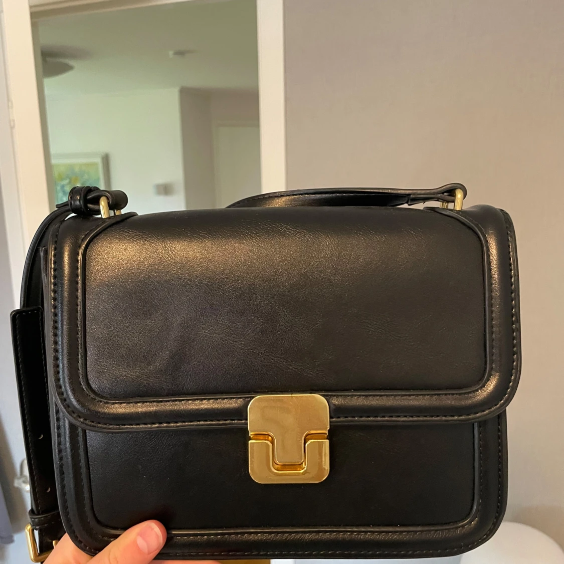 Jättefin, rymlig och praktisk crossbody-väska från Mango i fint skick. Den har svart fuskläder och gulddetaljer, och spännet i fram har små ”repor” men det är inget som man ser eller tänker på vanligtvis. Justerbart band och en innerficka. Höjd: 20 cm, bredd: 25 cm, djup: ca 7 cm.