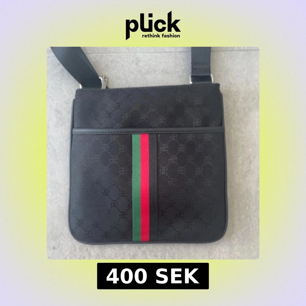 Snygg svart axelväska från ett märke med diskret ett coolt mönster över hela väskan. Framsidan har en ikonisk grön och röd rand, och baksidan har en praktisk dragkedja. Väskan har justerbar axelrem och är tillverkad i slitstark syntet med detaljer i skinn.