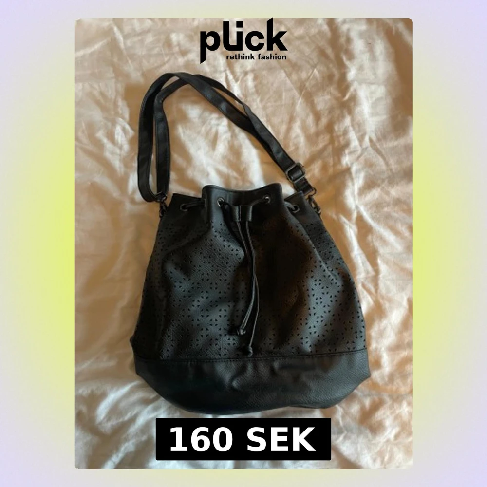 Vintage Svart medel stor väska i skinnimitation med justerbar axelrem och utskurna detaljer i triangelform. Väskan har snörning upptill för att stänga och en mjuk, rundad form som gör den både praktisk och trendig.