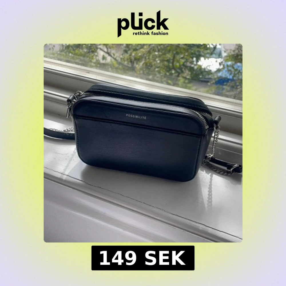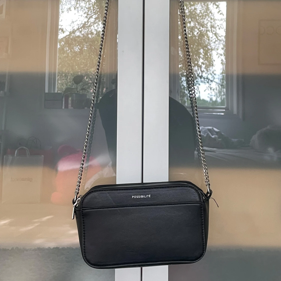 Stilren svart axelväska från HM med silverfärgad kedjerem och dragkedja. Väskan är rektangulär och tillverkad i slätt skinnliknande material. Perfekt storlek för mobil, plånbok och andra essentials. Enkel och clean design med diskret logga framtill. Skriv om du undrar något 💕